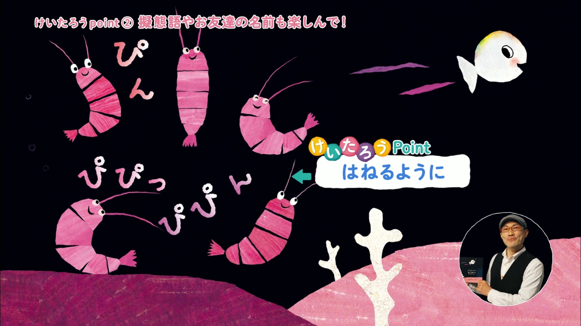 またキュートなピンク色の5ひきが登場するシーンでは「ぴん」「ぴぴっ」「ぴぴん」の読みかたについて、《はねるように》読もう、とテロップが現れます。