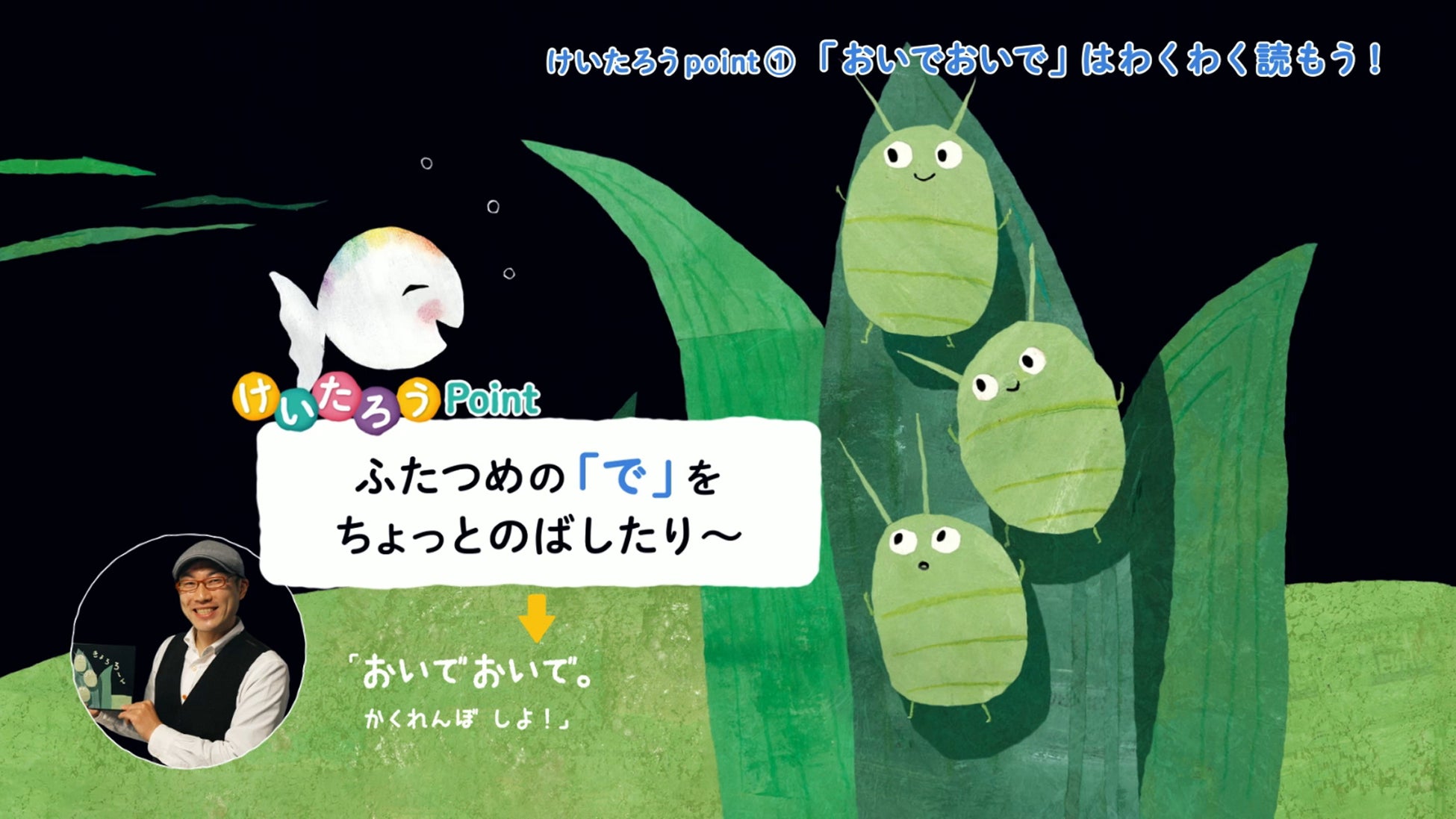 「おいでおいで~」と2こめの「で」を少しのばすとやさしく語りかけるように聞こえることや、「おいで」「おいで」と区切って読まずに、ひと息で読むと楽しい感じがかもしだされることなど、すぐにマネできそうなポイントがテロップ『けいたろうPoint』となって現れるのです。