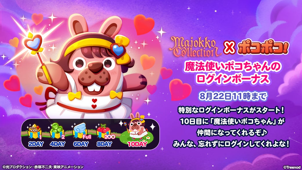 期間中、「LINE ポコポコ」にログインするだけで、クローバーやチェリーなどゲーム内アイテムをログイン報酬としてプレゼントいたします。さらに10日間ログインすると、コラボ限定仲間の「魔法使いポコちゃん」を仲間にできます。報酬は1日1回ずつ入手可能です。