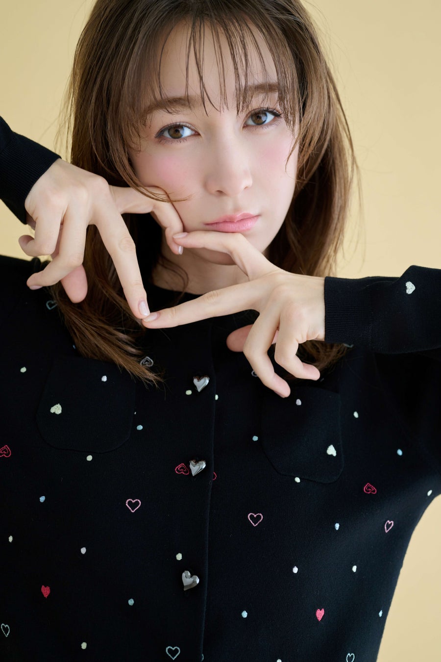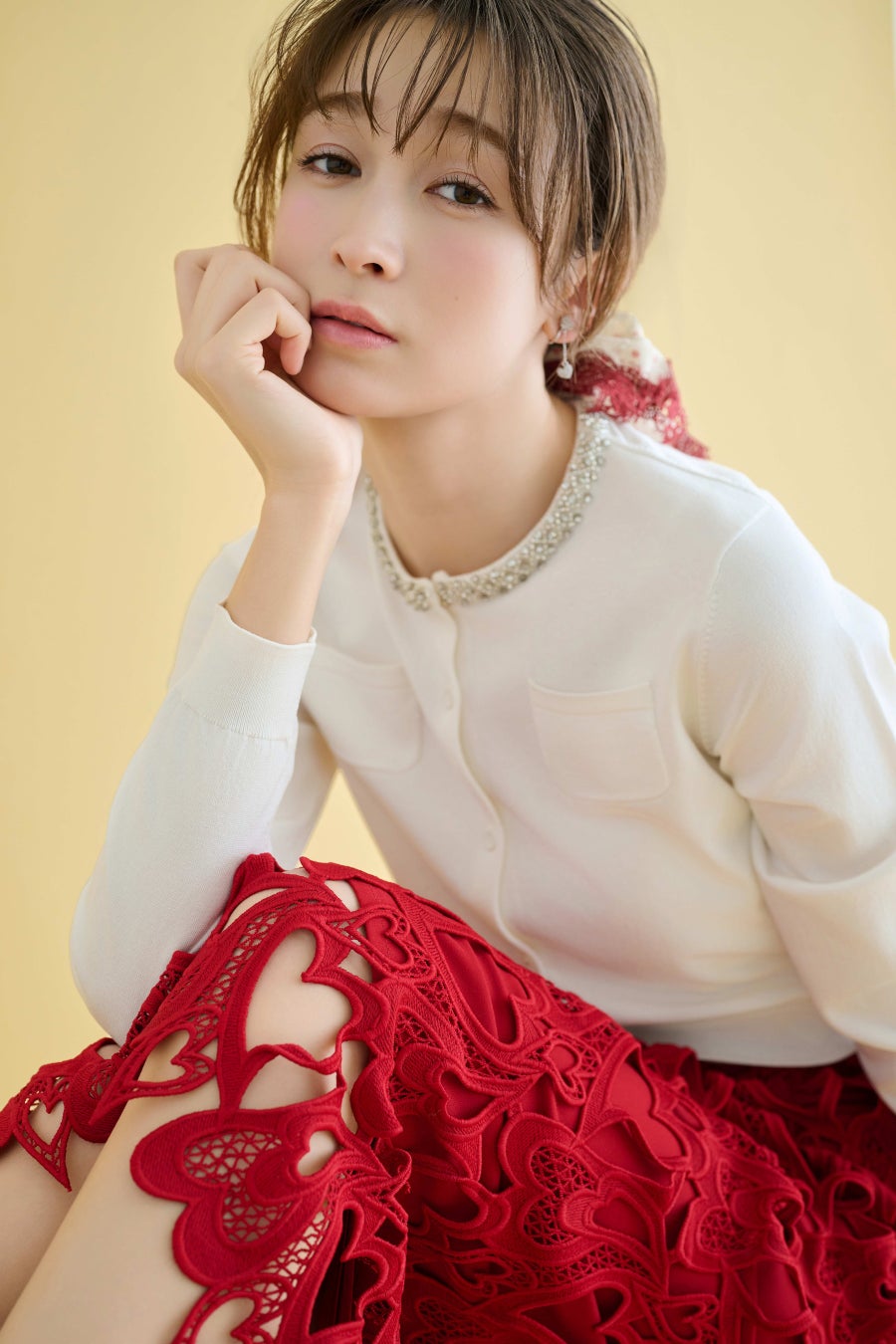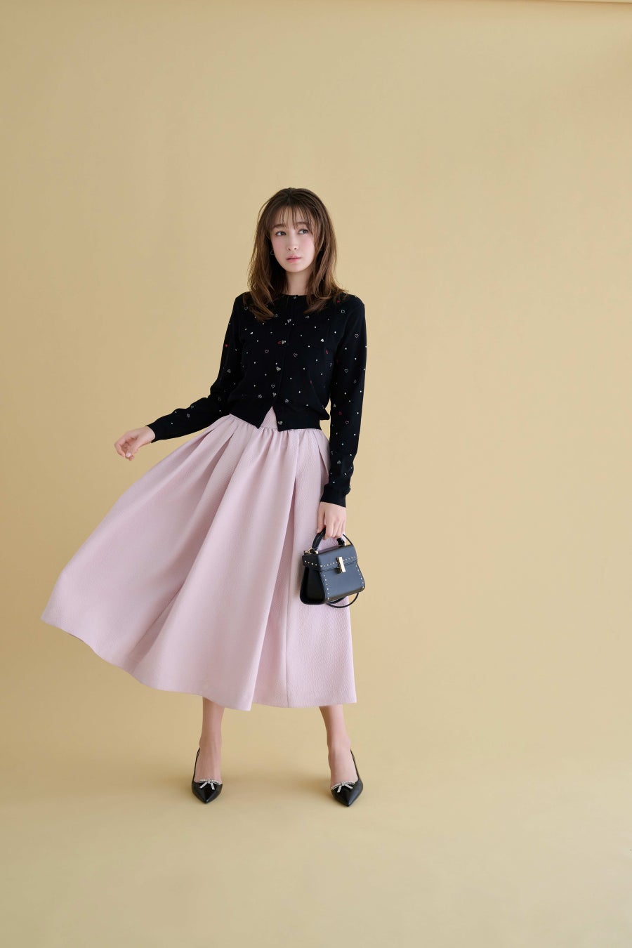 ハート刺繍を散りばめたカーディガンを主役に、程よく大胆なボリュームスカートを合わせて、印象は一気にモードへ。フロントに並ぶハートボタンが、視線を集めるアクセントに。