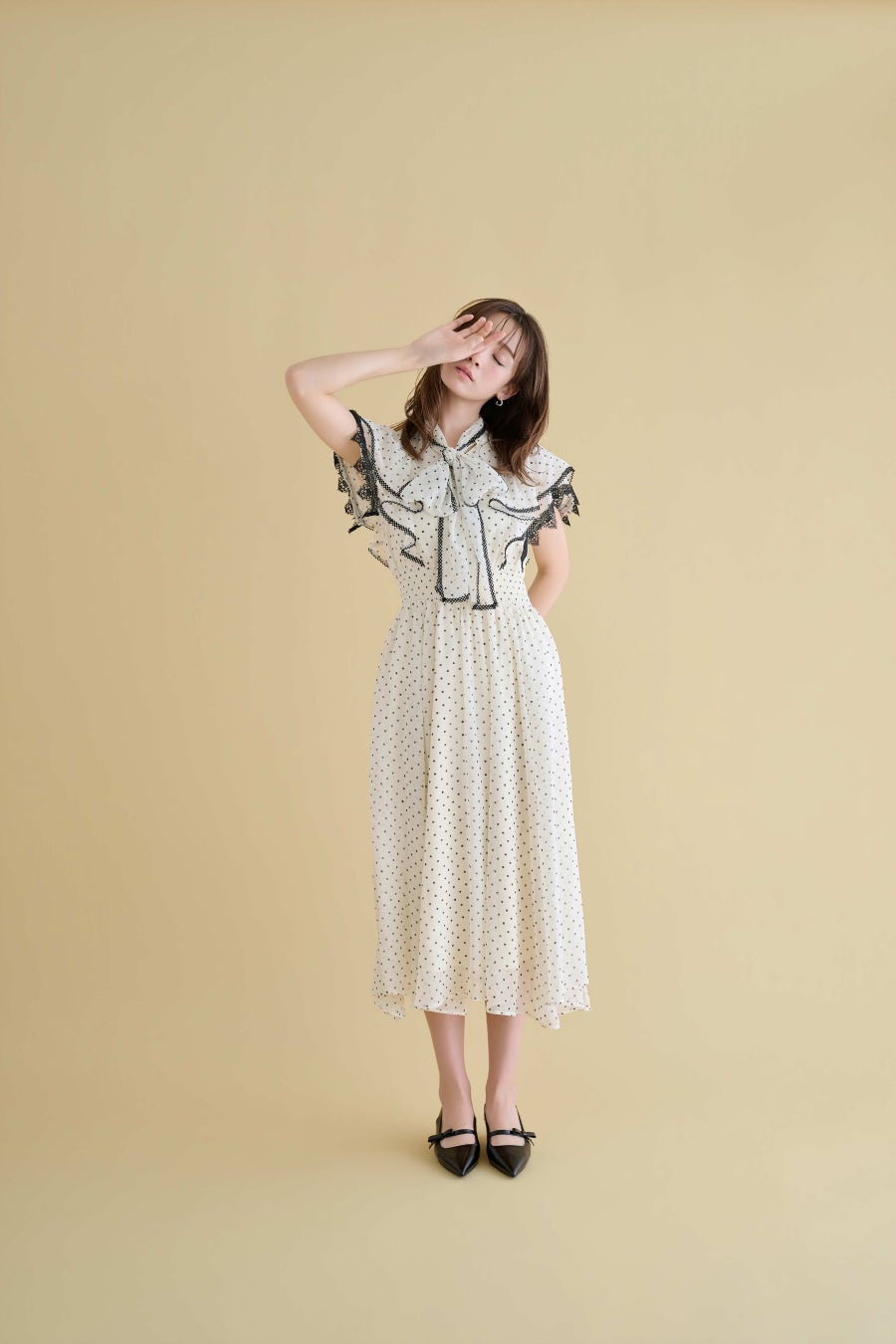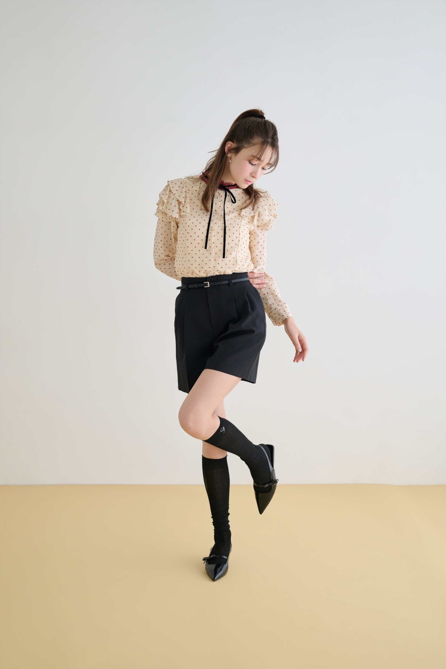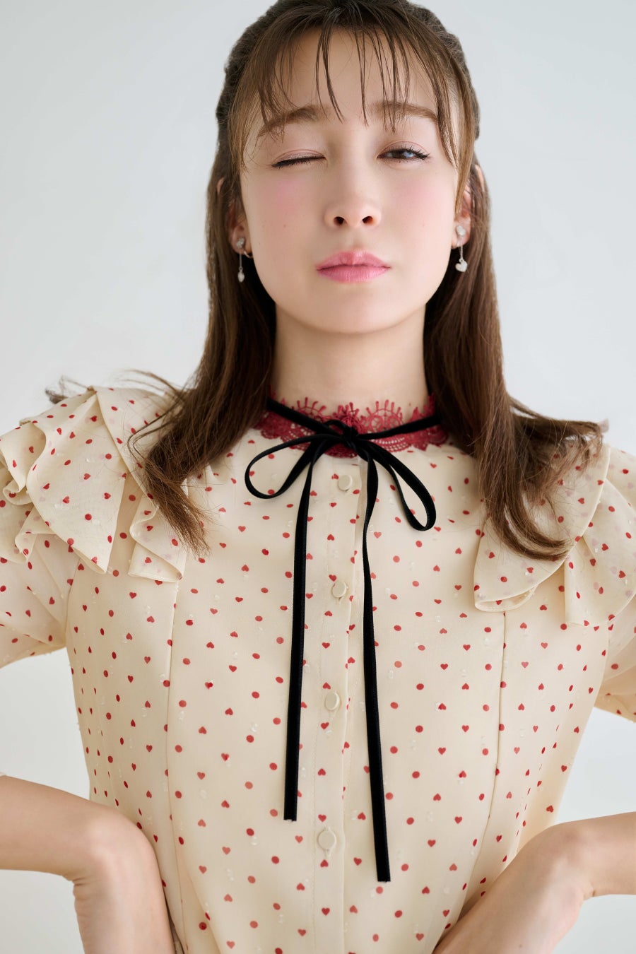 トレンドのポルカドットに、ハートを織り交ぜたプリント。視線を惹きつけながらも、大きさを抑えたドットが着こなしやすさを叶えます。レザーライクジャケット合わせで、デイリーにも映える一着に。