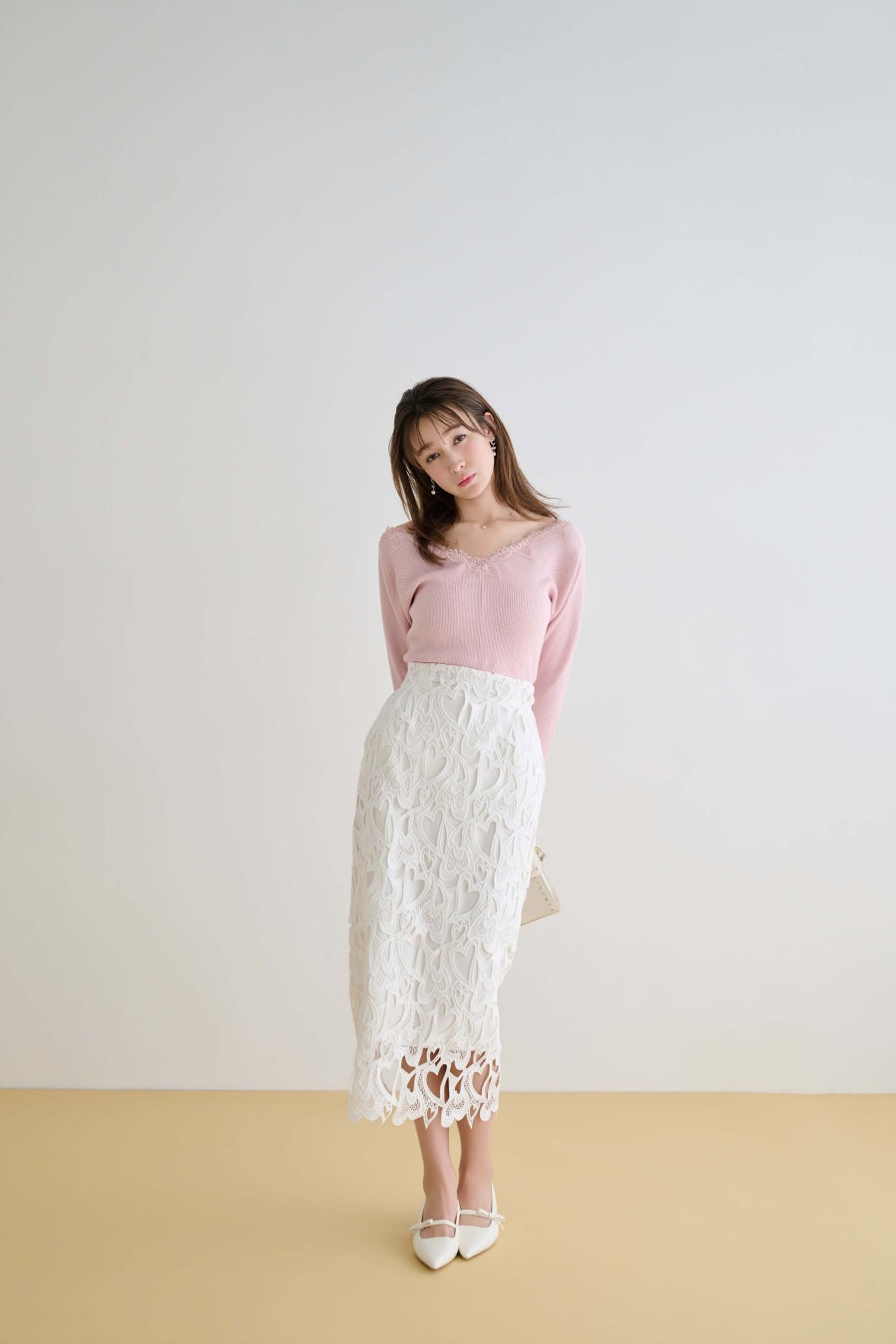 オリジナルのハート柄は、抜け感と繊細さを計算。歩くたびに表情を変えるヘムラインが、装いに奥行きを与えます。ビジュー付きカーディガンを合わせて、アクセサリーに頼らない完成度へ。