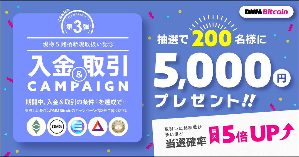 4周年を迎え、皆様に日頃の感謝の気持ちを込めまして、現在開催中の「おかげさまで4周年!DMM Bitcoinが進化する!6カ月連続キャンペーン(https://bitcoin.dmm.com/campaign/20220107_01)」の第3弾として「抽選で200名に5,000円が当たる!入金&取引キャンペーン」を実施することをお知らせいたします。