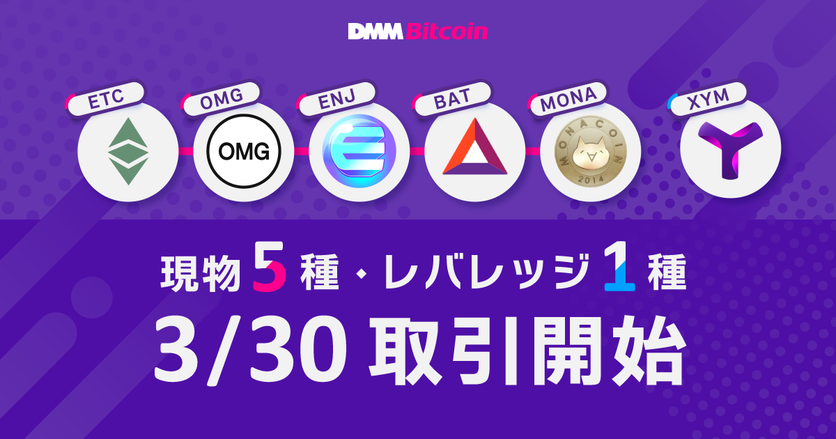 DMMグループの株式会社DMM Bitcoin(本社:東京都中央区、代表取締役社長:田口 仁、暗号資産交換業 関東財務局長 第00010号、第一種金融商品取引業 関東財務局長(金商) 第3189号 https://bitcoin.dmm.com/ )は、3月30日(水)より、以下のとおり現物取引において新たに5種類の暗号資産及びレバレッジ取引において新たに「シンボル(XYM)」の取扱いを開始いたします。