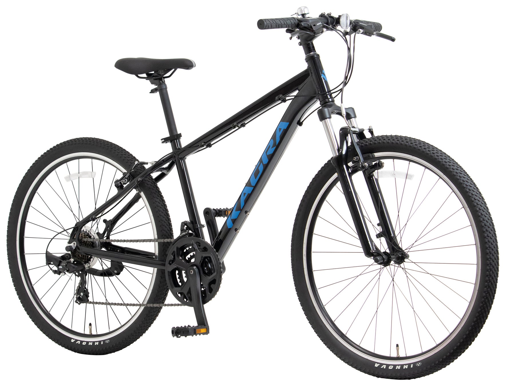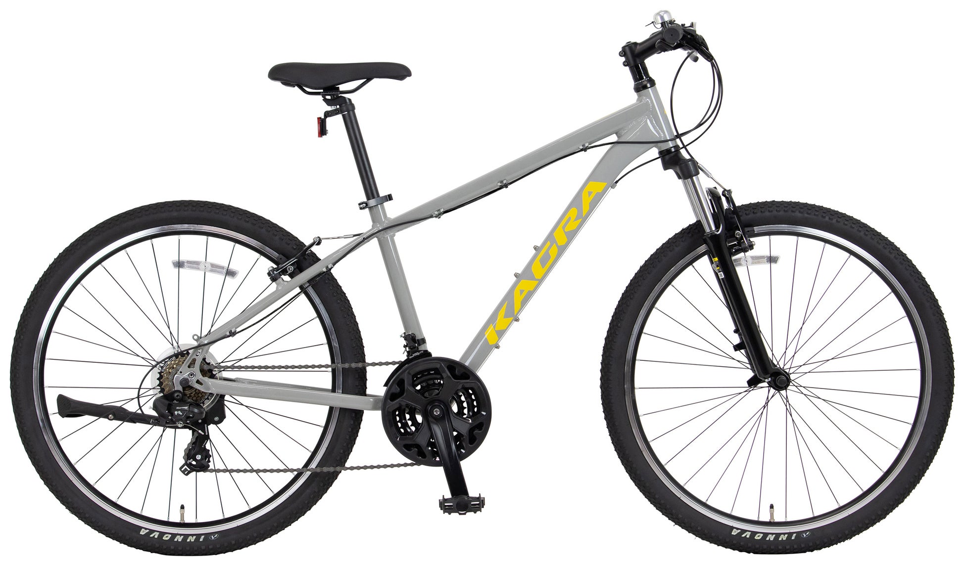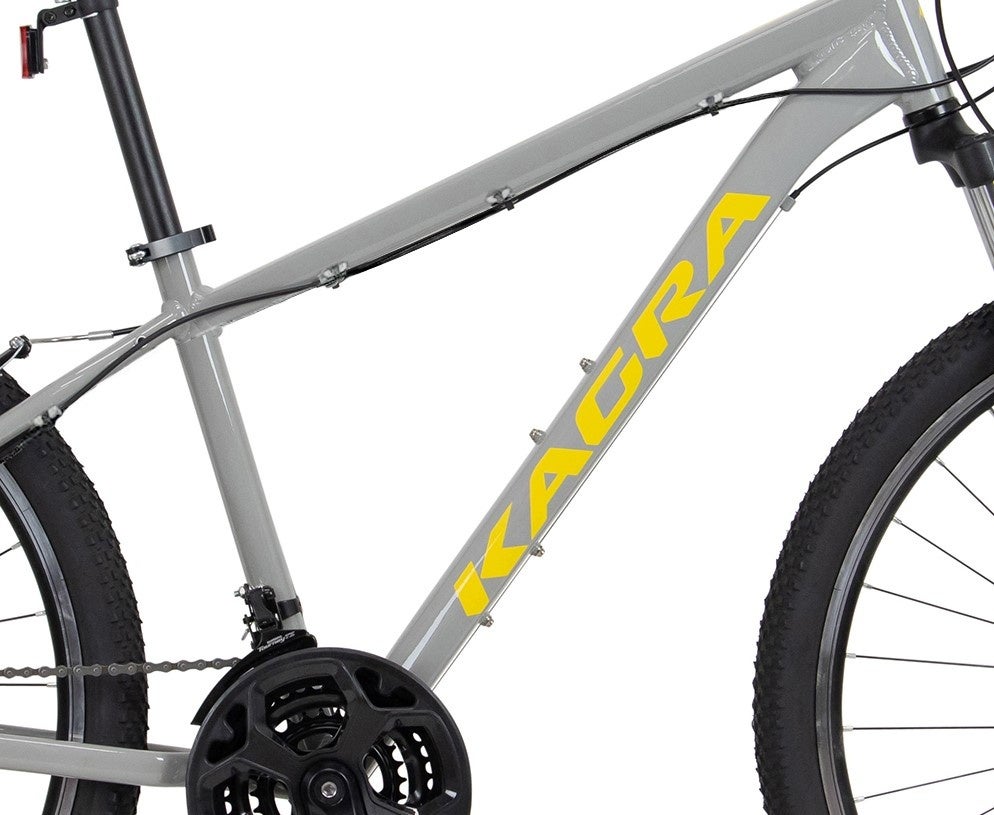 KAGRA D-3はサスペンション付きフロントフォークを装備した街乗り用のマウンテンバイクで、段差や凹凸の多い都心の路面でも優れた快適性を実現しています。さまざまなシチュエーションで快適なペダリングを実現する21段変速ギアを搭載。軽量なアルミフレームを採用し、スポーティな走行を楽しめます。