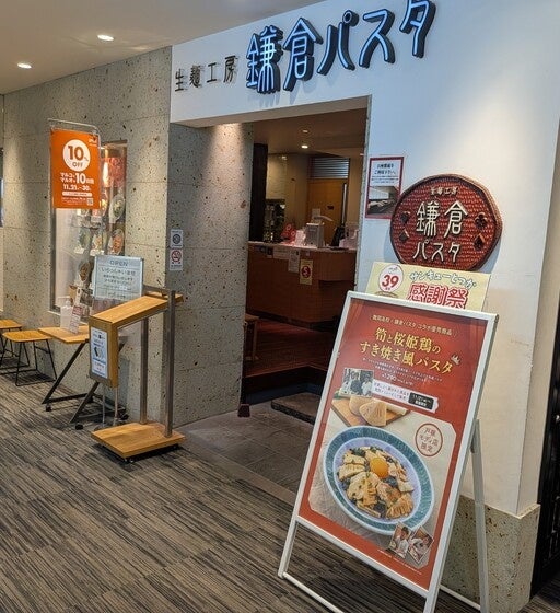 鎌倉パスタは、全国に約200店舗を展開する生パスタ専門チェーンです。もちもち食感のパスタを中心に、和風や洋風など多彩なメニューを提供。店内は「お座敷」と鎌倉彫の内装をあしらい、落ち着いた和モダンな雰囲気でゆったりと食事ができるのが魅力です。
