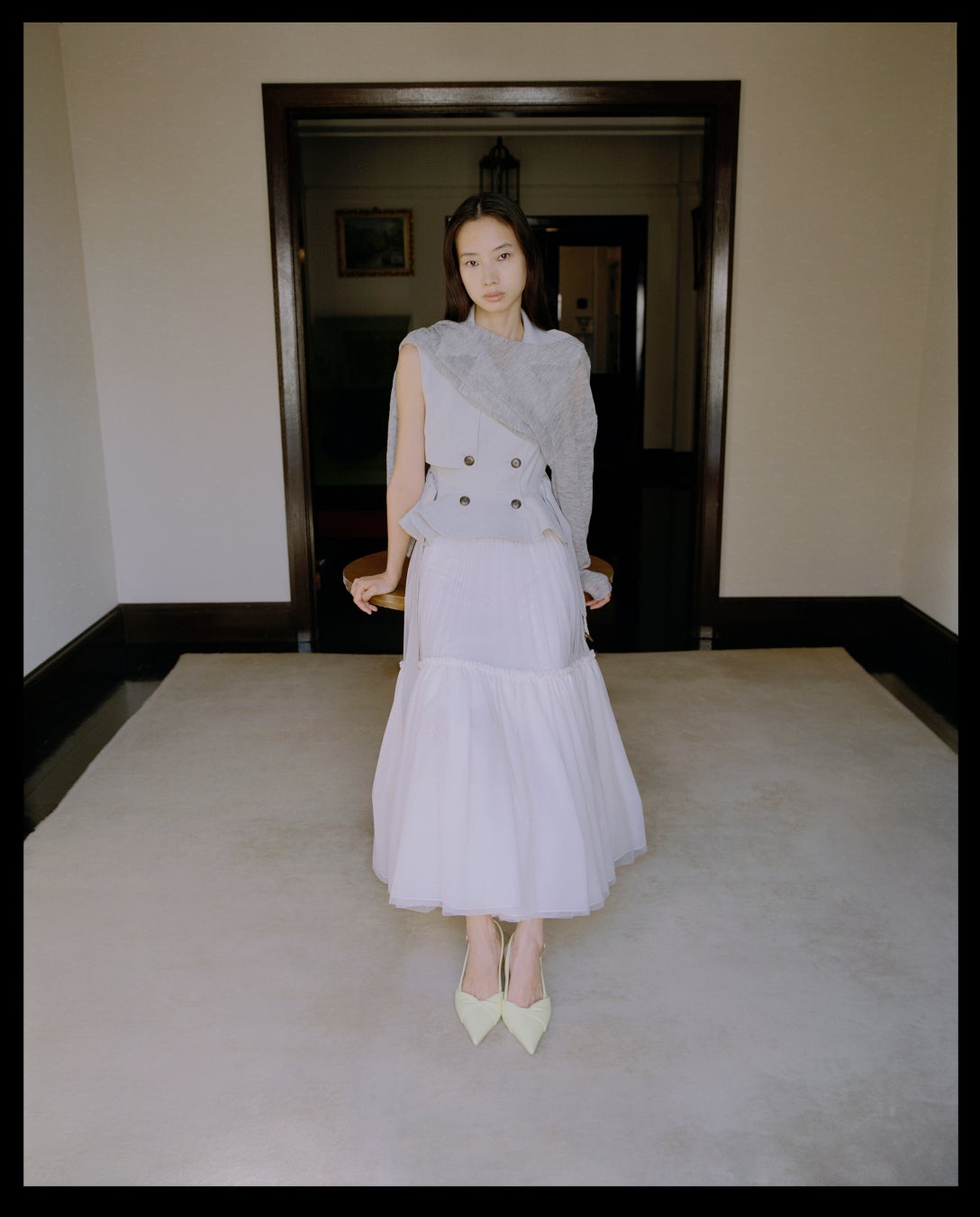 ペプラムが描く柔らかな曲線が、歩くたびに奥行きを生む。