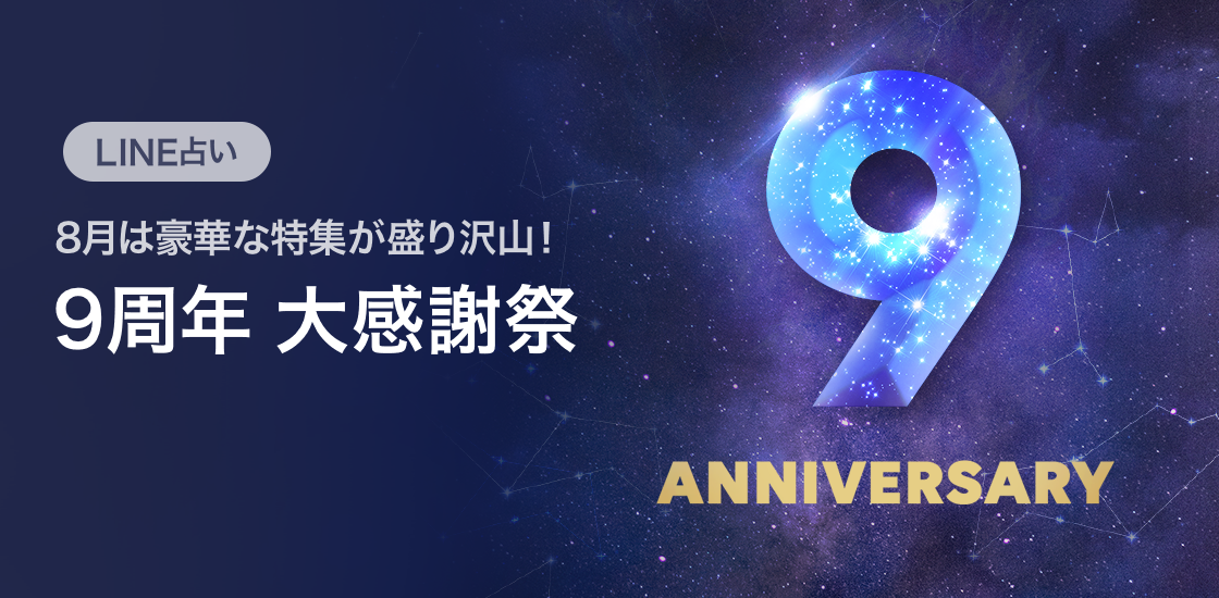 このたびLINE占いが9周年を迎えることを記念して、感謝の気持ちを込めて豪華特集「LINE占い 9周年 大感謝祭」を8月1日(月)~8月31日(水)の間、開催することが決定いたしました。