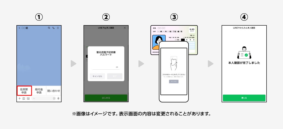 「LINE Pay 公的個人認証サービス」は、先行して東京都渋谷区、神奈川県座間市、富山県魚津市、愛知県東郷町、広島県福山市、広島県三次市のLINE公式アカウントにおいて試行的に導入しており、住民票の写し等の郵送申請や納税証明書申請などの行政サービス提供において活用されています。
