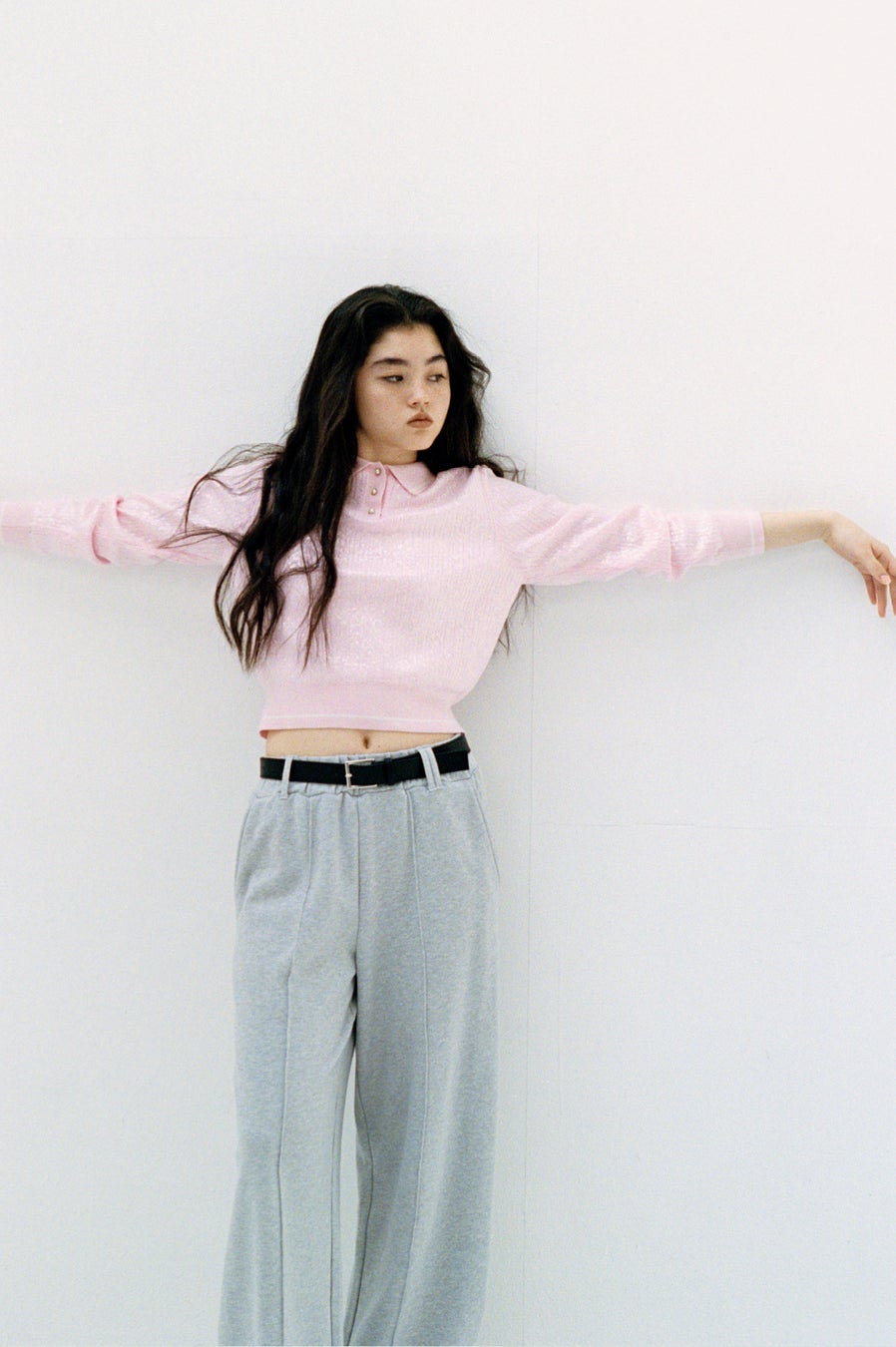 スパンコールが煌めく衿つきニットプルオーバー。