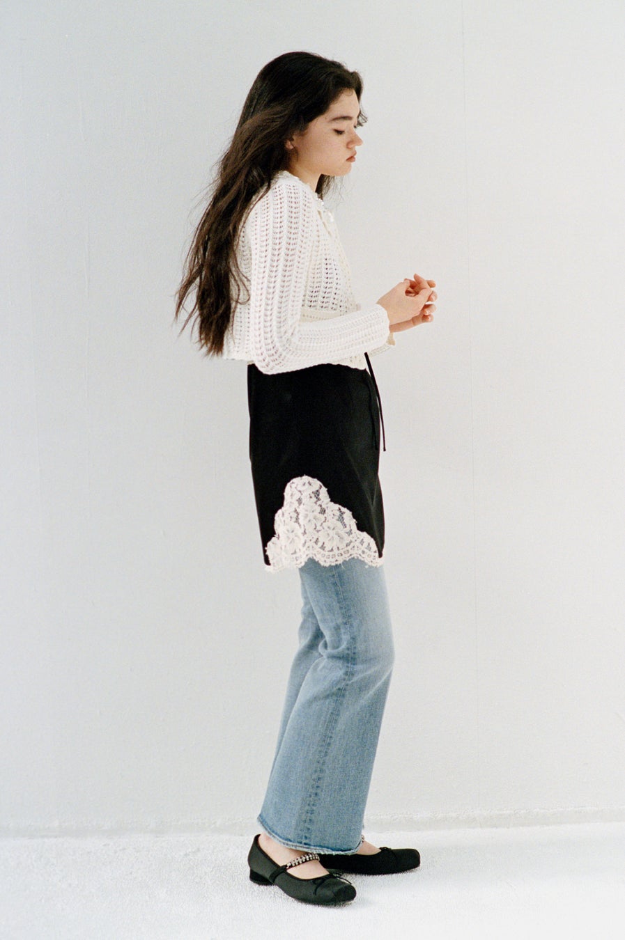 フラットシューズのような抜け感はそのままに足首が綺麗に見えるよう、低めの円柱ヒールを付けました。シアーなチュールで抜け感のある今年らしいストーン素材のWHT、トゥ先のタックと甲のビジューがリッチなサテン素材のMNTとBLKの3色展開。シルバーのロゴとハート風モチーフのREDがアクセントのインソールで置き面もキャッチーな贅沢なアイテム。