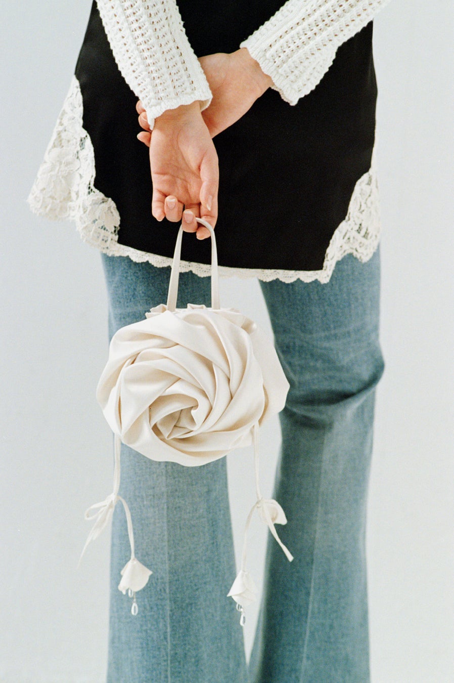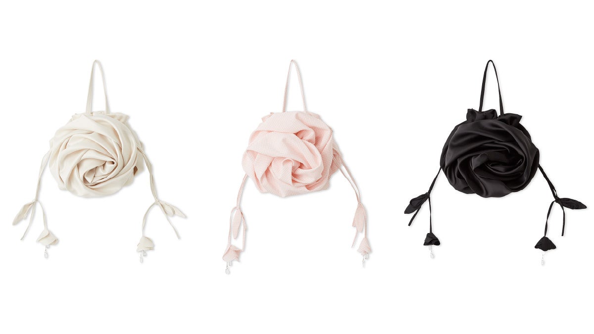 ころんとした形が愛らしい、生地を立体的にローズの形に仕立てたバッグ。