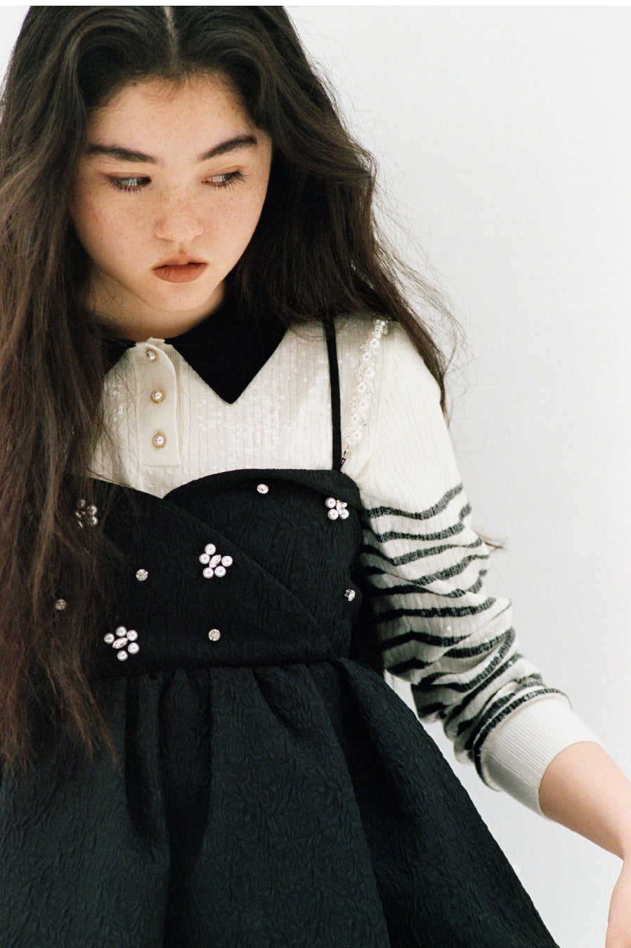 取り外し可能なビジューショルダーに加え、胸元にもビジューとパールを散りばめ、顔まわりを華やかに魅せます。特別なシーンはもちろん、デイリーのスタイリングも格上げしてくれるアイテムです。