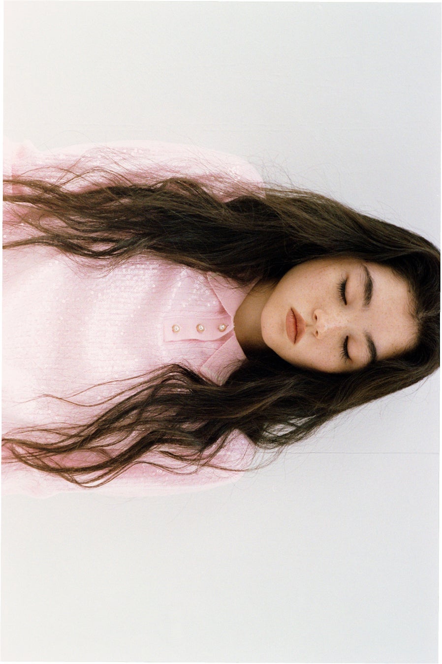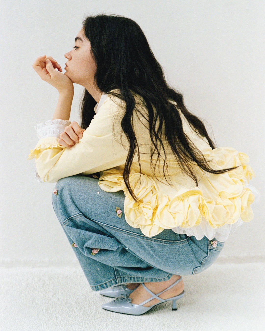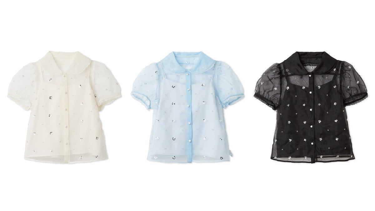 ビーズやスパンコールで小さなお花モチーフを作り、柔らかいオーガンジー生地に刺繍しました。丸襟の端にはレーステープをあしらい、小さめの袖とフロントのパールボタンで可憐さを演出。