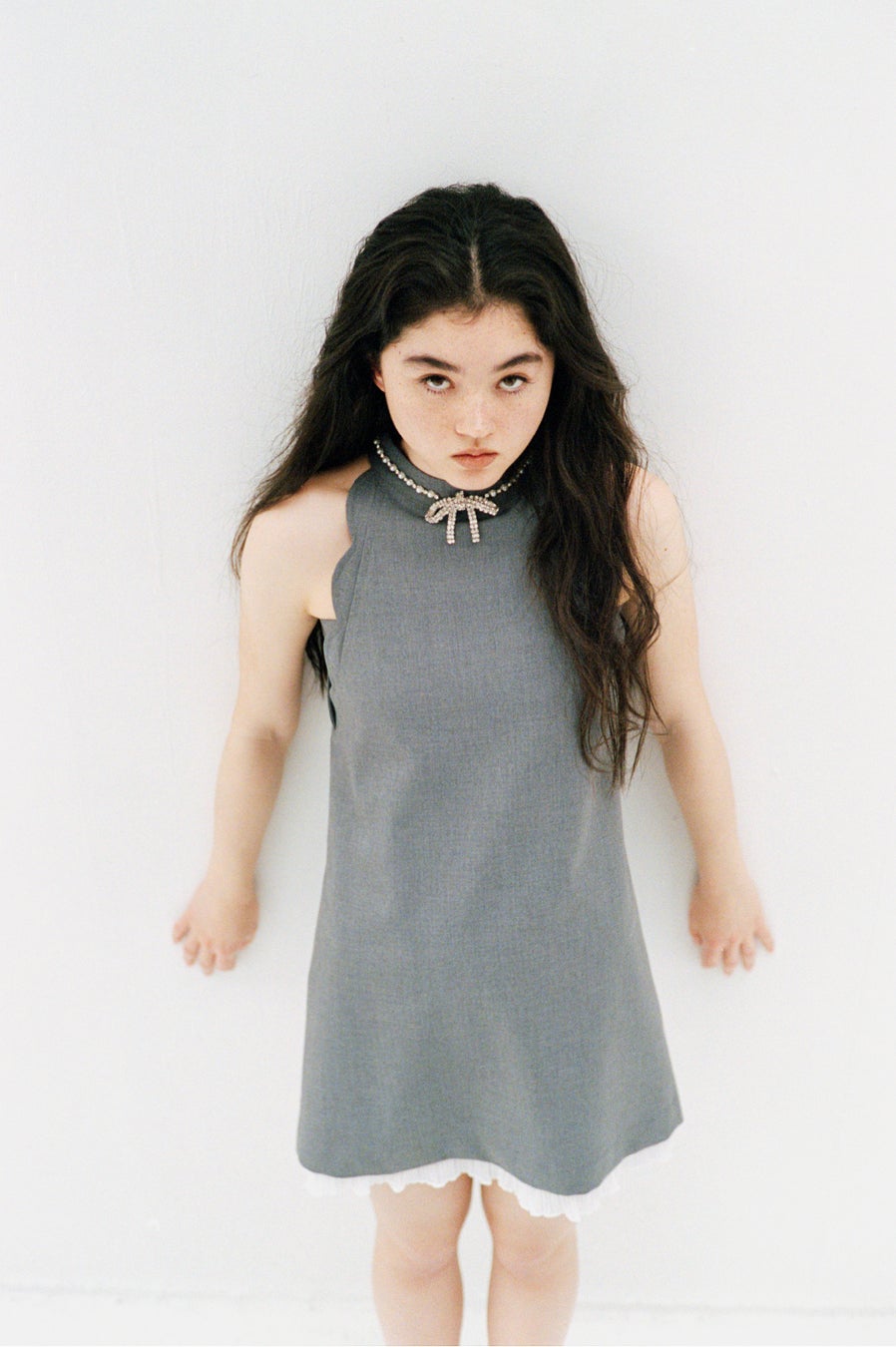 首元のゆれるリボンビジューが華やかなスカラップミニワンピース。