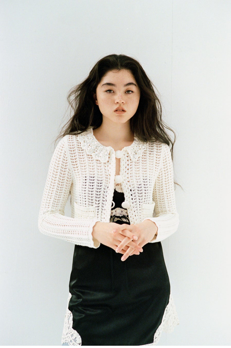 クラフト感ただようクロシェ編みビジューカーディガン。