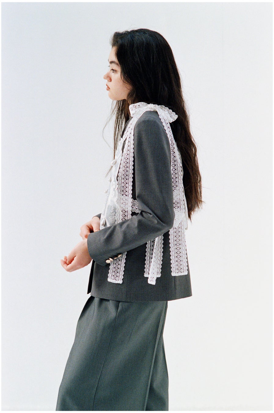 上品な艶のツイル素材とツイードのバリエーションでロングシーズン着まわしやすくアップデートしました。2段フリルで贅沢な仕様の襟とカフスは取り外しが可能。煌びやかな刺繍とビーズで洗練された印象に導きます。
