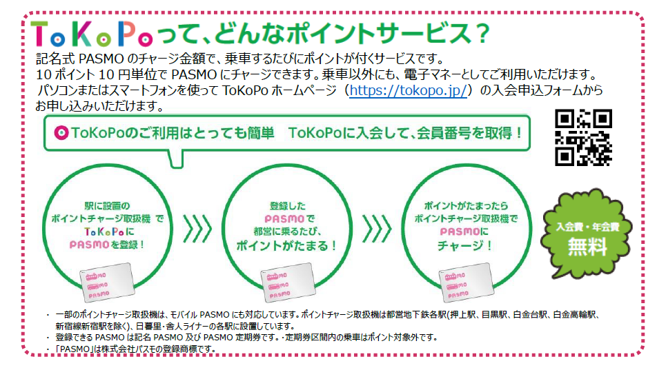 都営交通の会員制ポイントサービス「ToKoPo(トコポ)」は、都営地下鉄、都営バス、東京さくらトラム(都電荒川線)及び日暮里・舎人ライナーに乗るたびにポイントがたまり、現在11万人の方にご登録いただいております。