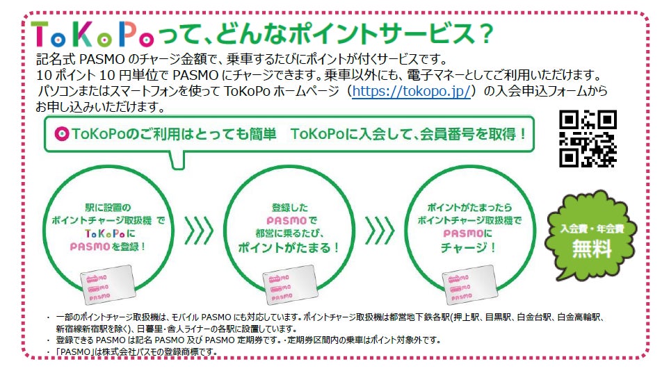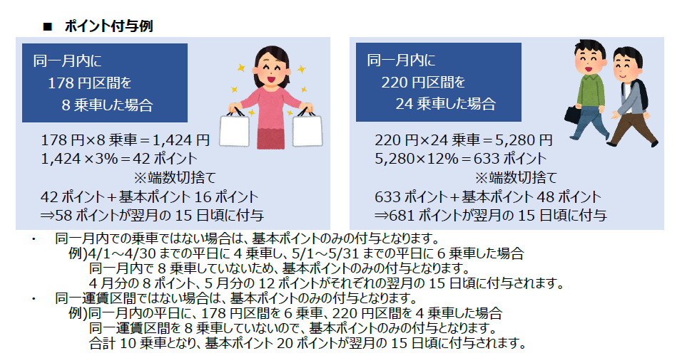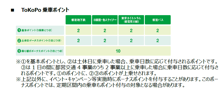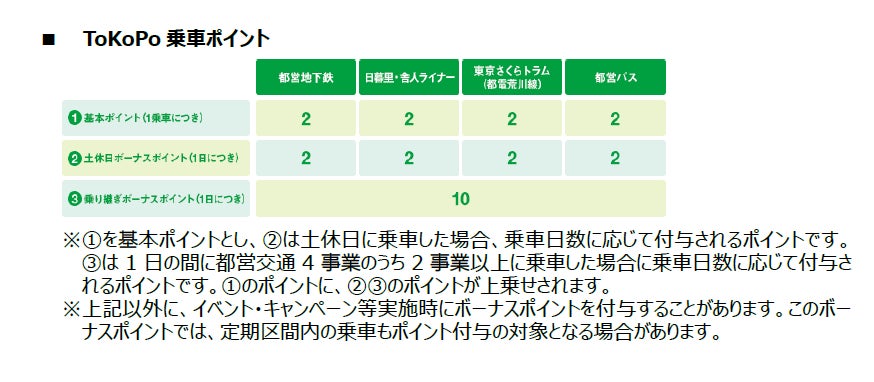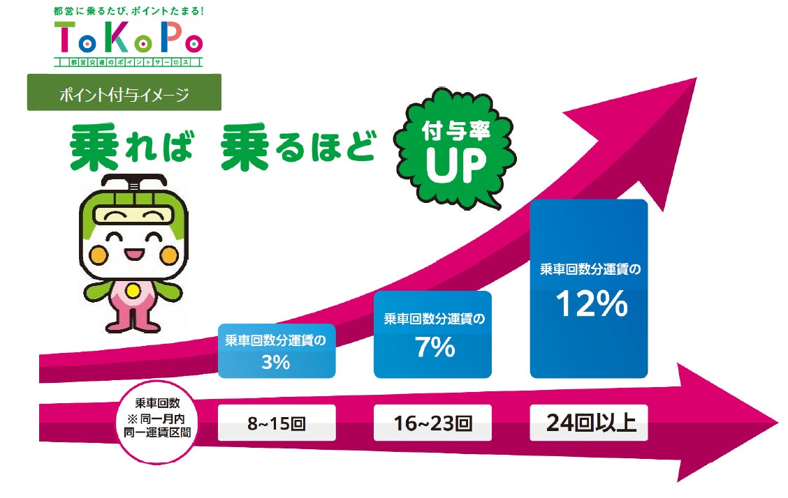 ToKoPo乗車ポイントに加え、都営地下鉄(浅草線、三田線、新宿線、大江戸線)及び日暮里・舎人ライナーのご利用時に、同一月内に同一運賃区間の乗車回数に応じて新たにポイントを付与します。※定期区間の乗車は乗車回数のカウントに含まれません。