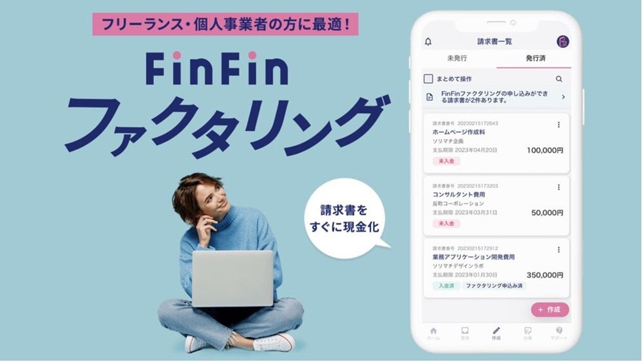 『FinFinファクタリング』は「スマホインボイスFinFin」で作成した支払期日前の請求書をPC・スマホから指定して申し込むだけで売掛債権を早期に受け取ることができるサービスです。