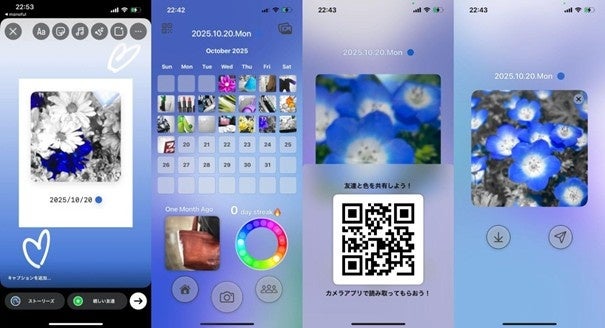 日常の風景を特別な写真として記録し、自分だけのカレンダーをつくれるアプリです。写真の中の特定の色だけが鮮やかになり、他の色はモノクロになる機能を通じて、自分だけのカレンダーをつくることができます。色を探しに行くことでいつもの景色を見る目が変わり、一つの思い出として記録することができます。