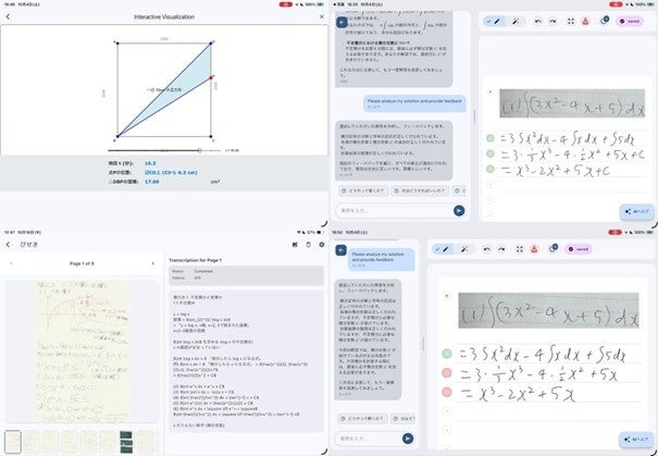 タブレット向けの数学学習アシスタントAIアプリです。問題集を撮影して取り込み、スタイラスペンで解答しながらAIに質問や採点を依頼できます。AIが苦手を分析し、自動で復習問題やアドバイスを生成。一人では解きづらい数学の問題も、AIと一緒に学ぶことで自力で解けるようになることをめざします。