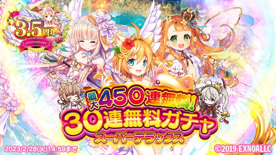 3.5周年アニバーサリー開催を記念して、過去のアニバーサリーキャラも当選する豪華な『30連無料ガチャ スーパーデラックス』を開催しております。本ガチャは期間中、最大450連無料で引くことができますので、是非、この機会に3.5周年アニバーサリーをお楽しみください♪