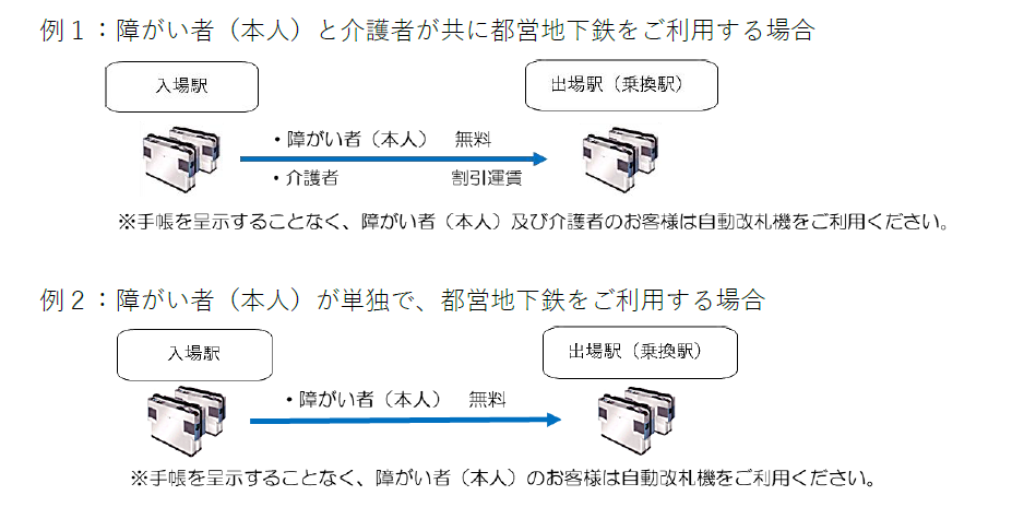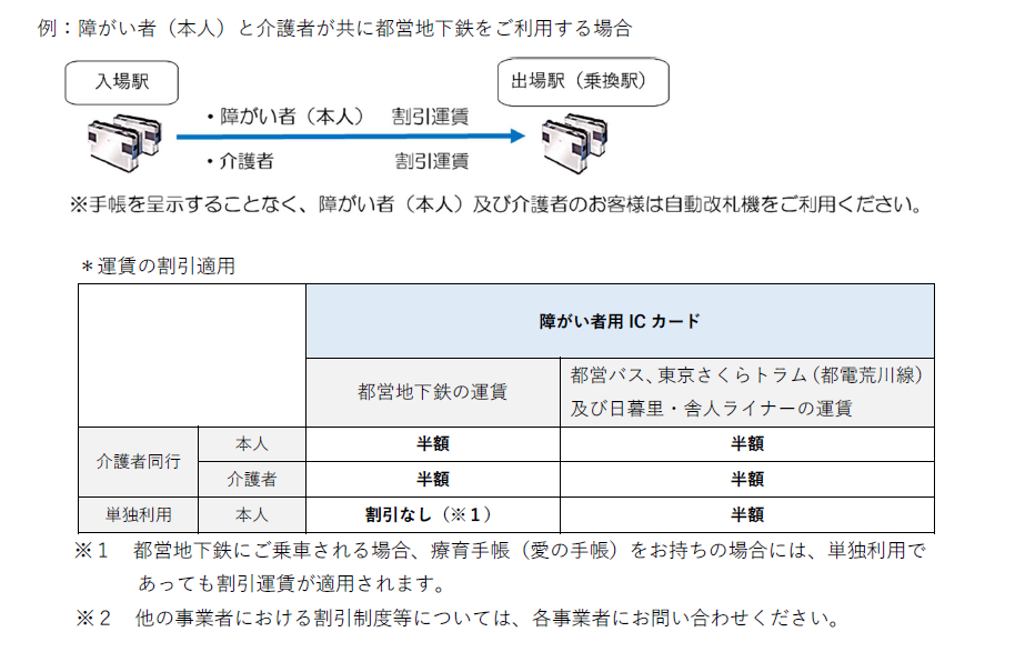 ・障がい者本人が、都営地下鉄、都営バス、東京さくらトラム(都電荒川線)及び日暮里・舎人ライナーにご乗車される場合、単独利用が可能です。
