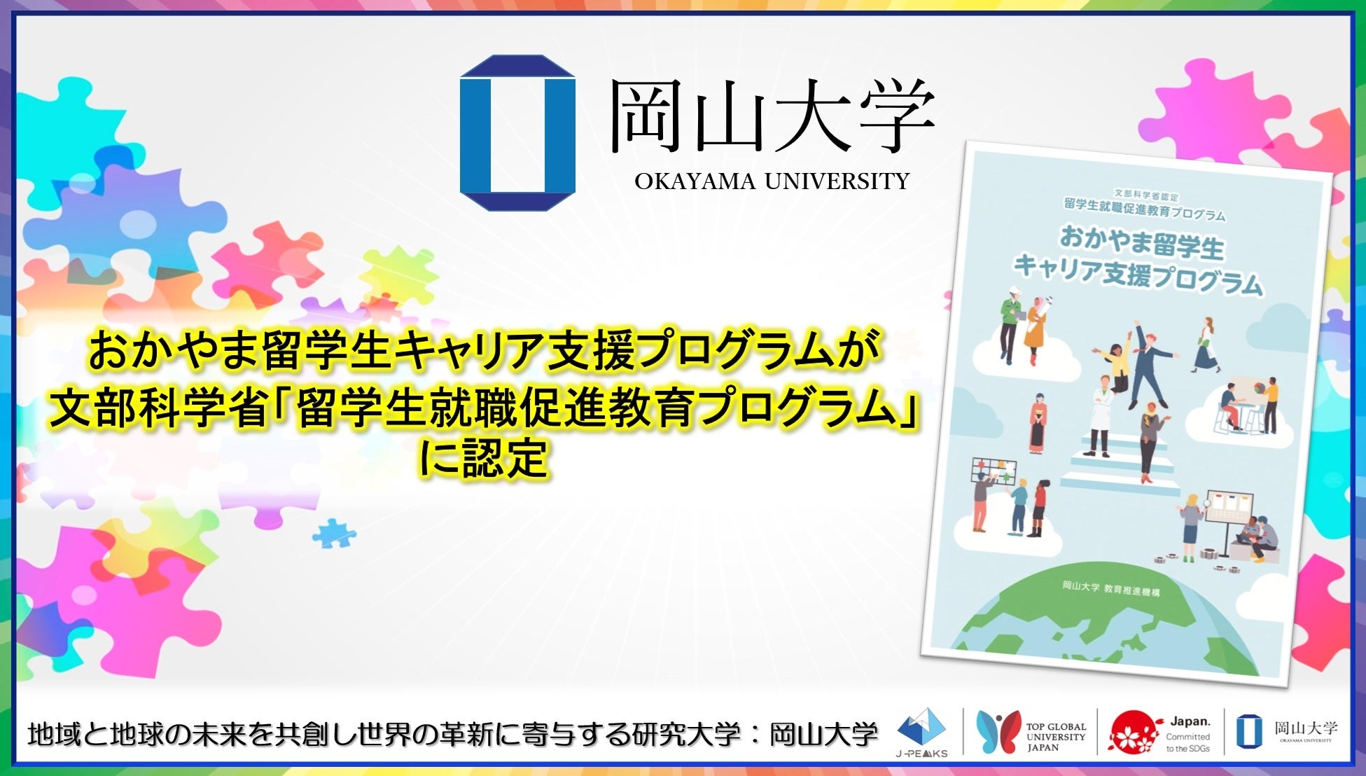 国立大学法人岡山大学(本部:岡山市北区、学長:那須保友)で開発した「おかやま留学生キャリア支援プログラム」が、文部科学省「令和7年度留学生就職促進教育プログラム」に認定されました。