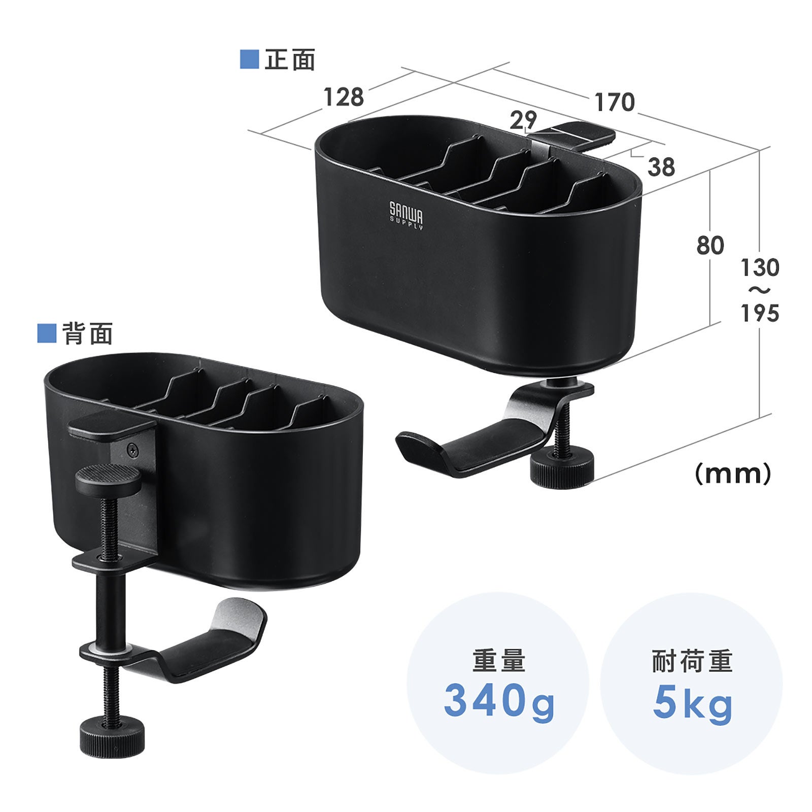 本製品のサイズは約W170×D128×H130~195mm、 重量は約340gです。