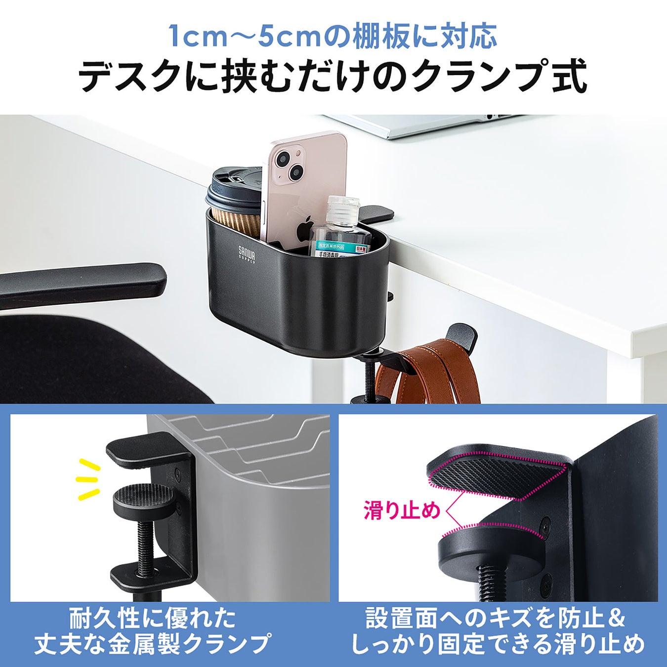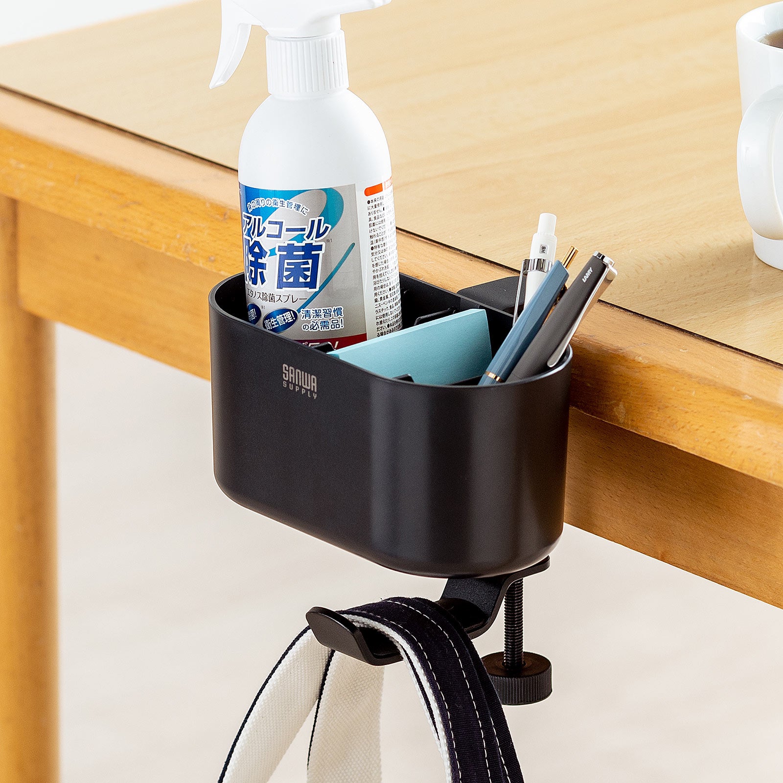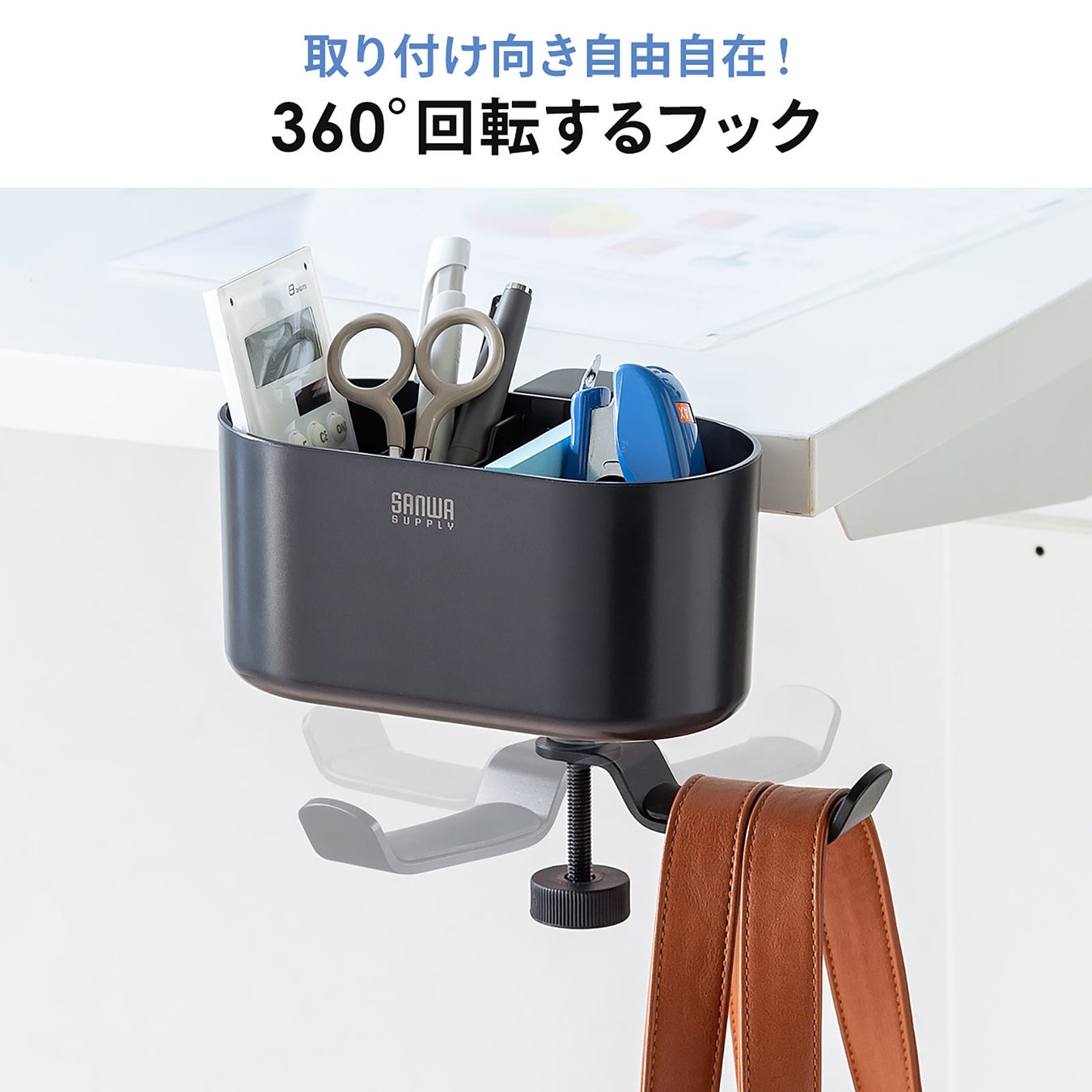本製品は、デスクの天板や棚板に固定して使う、小物入れ付きバッグハンガーです。手軽にバッグと小物の保管場所を作れます。