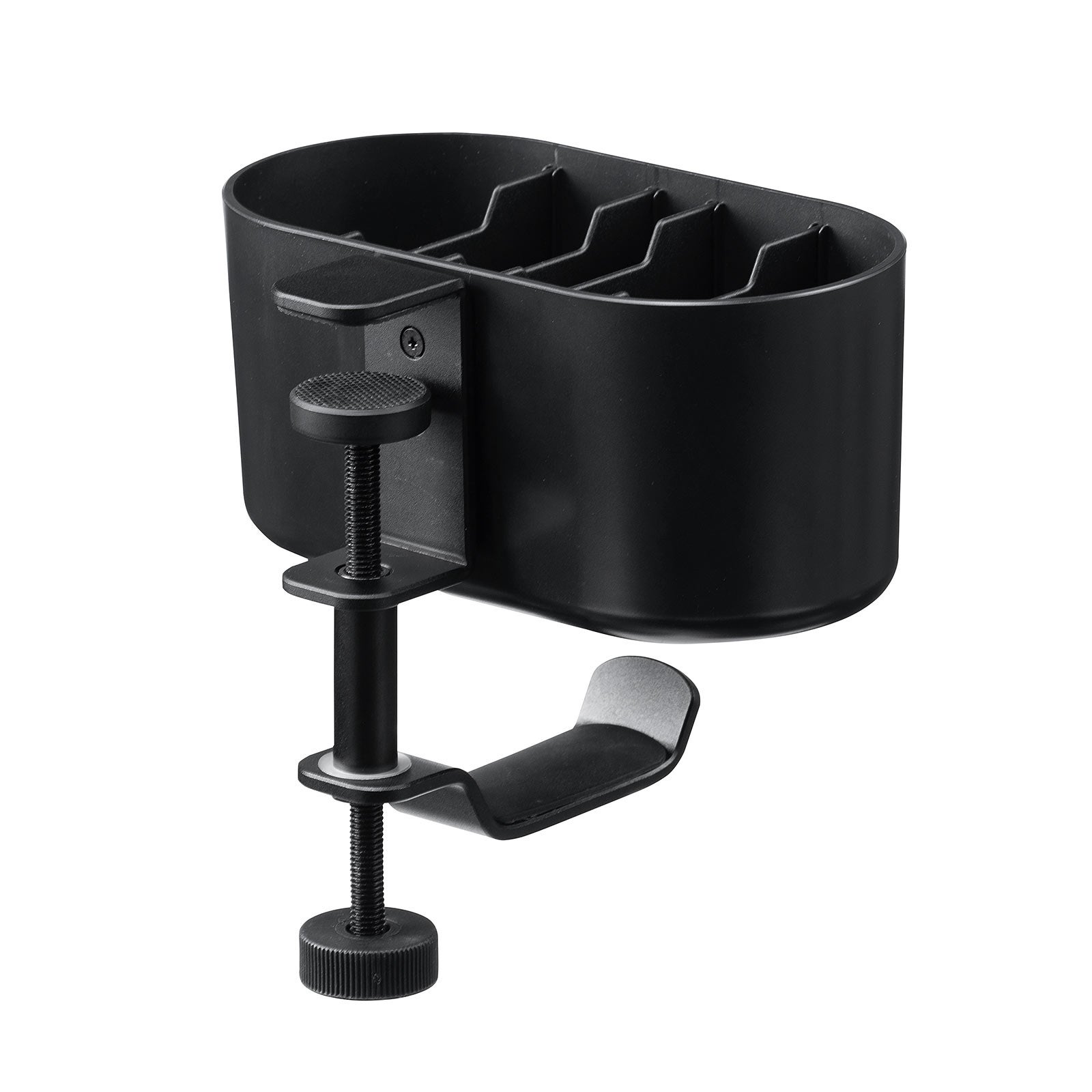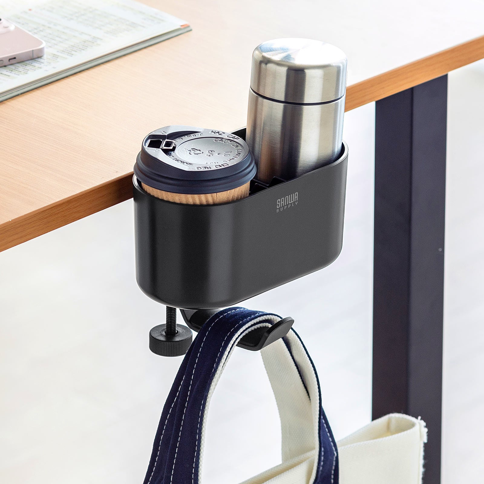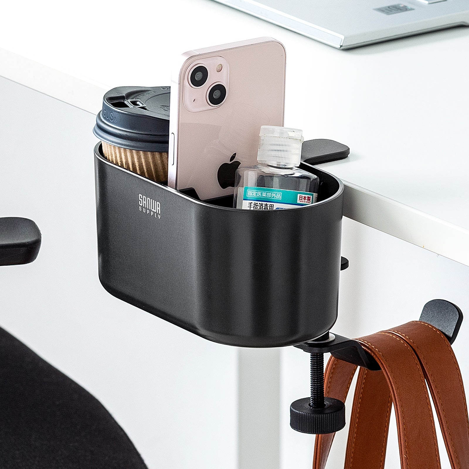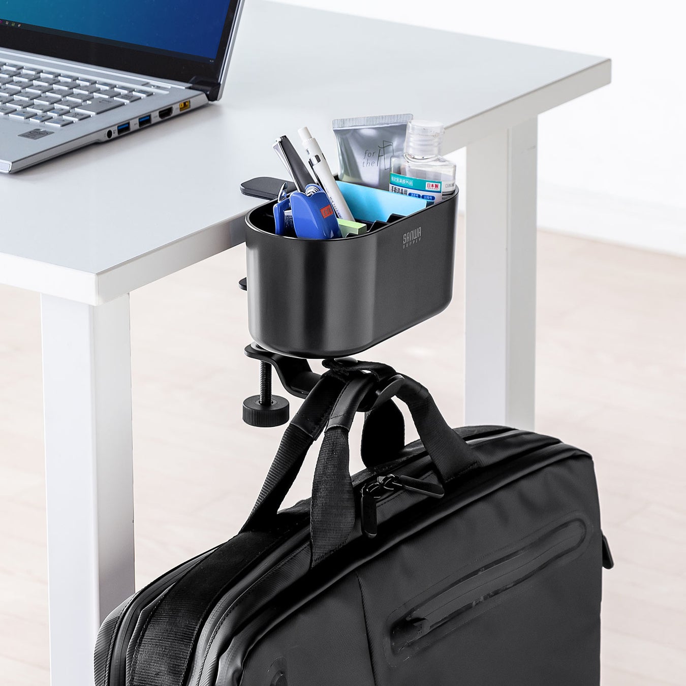 本製品は、デスクの天板や棚板に固定して使う、小物入れ付きバッグハンガーです。手軽にバッグと小物の保管場所を作れます。