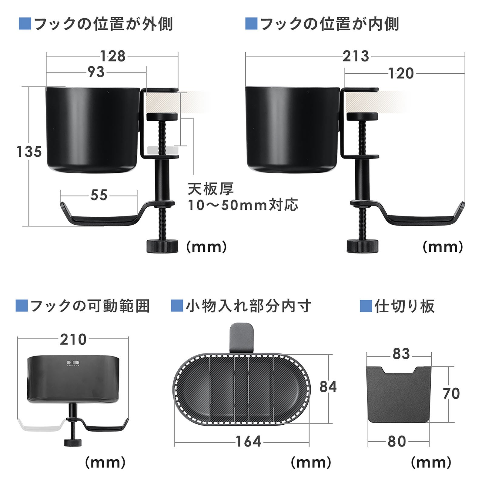 工具を使わずに装着できるクランプ固定式です。厚さ10~50mmまでのデスク天板に固定できます。