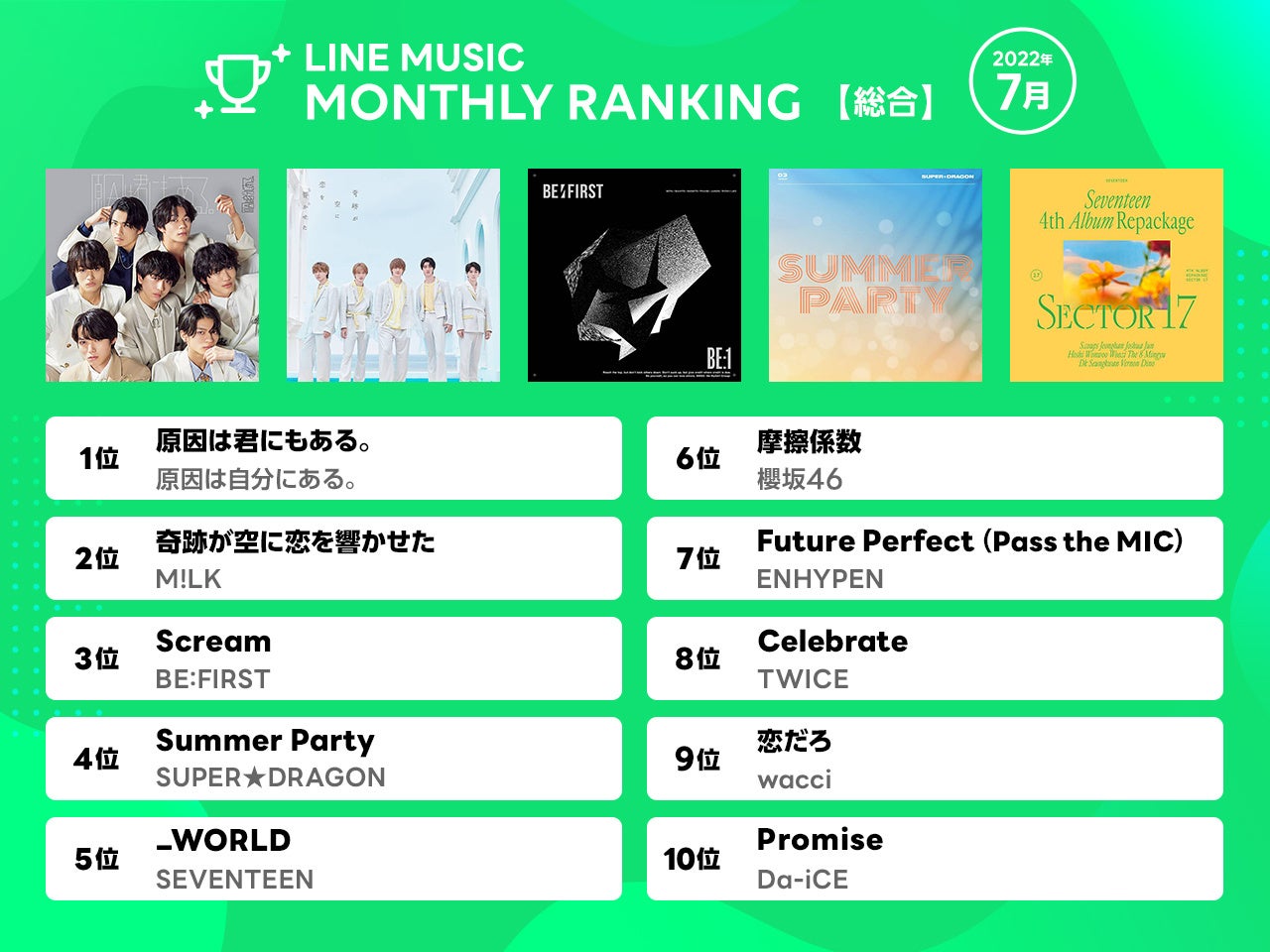 【2022年7月 LINE MUSIC 月間ランキング 】1位 原因は自分にある。「原因は君にもある。」、2位 M!LK「奇跡が空に恋を響かせた」、3位 BE:FIRST「Scream」!