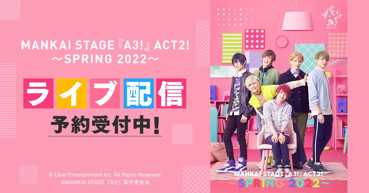 合同会社DMM.com(本社:東京都港区、会長 兼 CEO:亀山敬司 以下「DMM」)はMANKAI STAGE『A3!』ACT2! ~SPRING 2022~の2022年4月27日(水)18:00 東京公演千穐楽、2022年5月30日(月)14:00 東京凱旋公演千穐楽のライブ配信の予約販売を開始致しました。ライブ配信には公演終了後も楽しめるディレイ配信(見逃し配信)付きです。ご自宅や外出先のパソコン、スマートフォン、テレビ画面でお楽しみください。