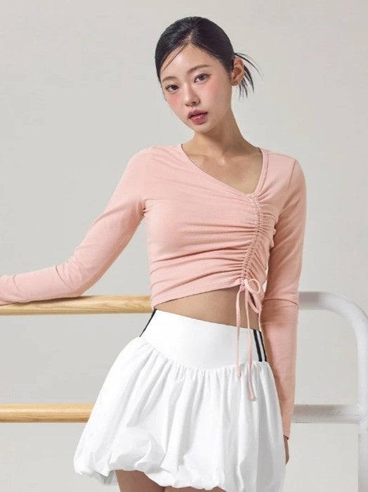 心地よいなめらかな肌触りが魅力のこのトップスは、女性らしいシルエットを引き立てます。丸みのあるアシンメトリーネックが首元から肩をすっきりと見せ、深すぎない開きで安心して着用できます。サイドのドローコードでシルエットを調整でき、女性らしさを引き立てつつ洗練された印象を演出します。