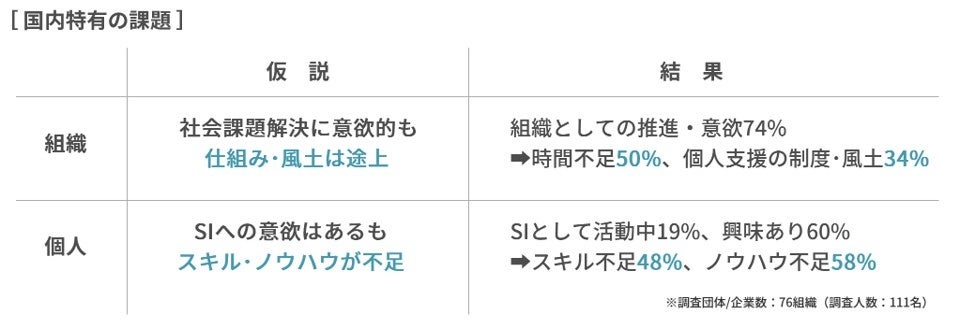 活動をスタートさせた2021年当初、組織で社会課題解決が進まない「国内特有」の課題について、76の企業や団体、計111名へのアンケートを実施しました。その結果から、組織および個人におけるそれぞれの課題があることがわかり、2024年まではSI個人の活躍応援にフォーカスして歩みを進めてきました。これは、組織起点でのSI普及には、組織化など時間が必要との判断もあったためです。