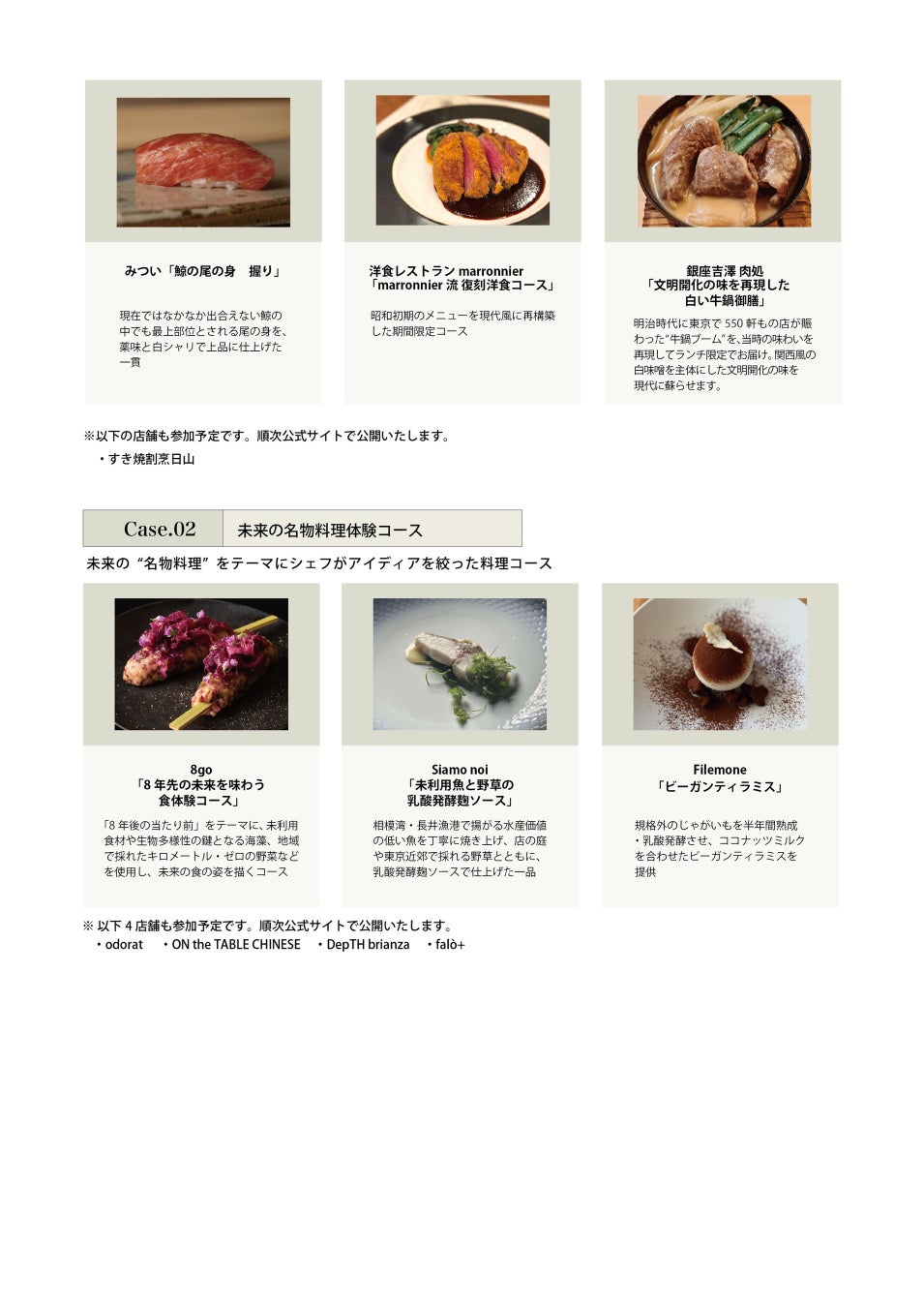 2026 年のテーマは「過去・現在・未来を紡ぐ名物料理」。 現在の東京を代表するトップレストランが「世界に誇る名物料理」を提供いたします。さらに「江戸・明治の味 が楽しめるコース」「今では味わえない名物料理復刻コース」「未来の名物料理体験コ ース」など、江戸時代から 現在、未来の東京を担う料理を体験いただける特別企画を複数ご用意。 江戸時代から 400 年以上続く食文化を、“体験” として再編集し、未来へつなぎます