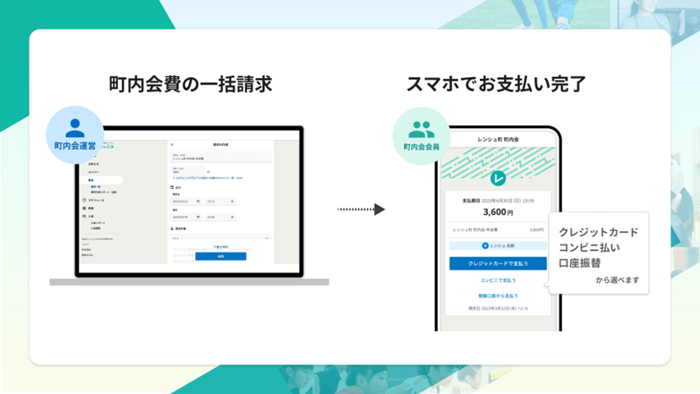 ●それぞれの町内会会員は、通常の集金(戸別訪問による現金払い)と「GMOレンシュ」をつかったオンライン決済(クレジットカード決済・口座振替・コンビニ払い)を選択できるようになります。