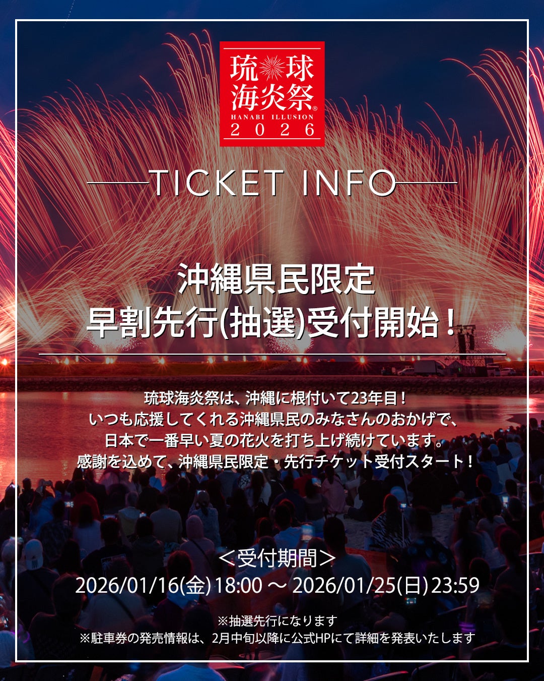 すでに開催を発表しております「第23回琉球海炎祭2026」につきまして、2026年1月16日(金)18:00より、沖縄県民限定早割先行(抽選)受付を開始いたします。