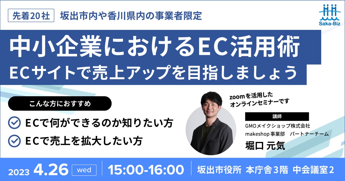 GMOインターネットグループのGMOメイクショップ株式会社(代表取締役社長CEO:向畑 憲良、以下、GMOメイクショップ)と、香川県坂出市の公的ビジネス相談所である坂出ビジネスサポートセンター(センター長:晄 直紀、以下、Saka-Biz)は、2023年3月31日(金)より連携を開始いたしました。