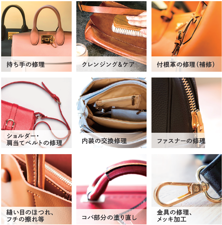 思い出や愛情が詰まったバッグをいつまでも大切に使うことも環境に貢献できる身近な「サステナブルファッション」です。ファスナーの修理や持ち手の交換といった定番のバッグ修理に加え、傷みやすい金具のメッキ加工、コバ部分の塗り直し、クレンジング&ケア、カラーリングなどのバッグ修理がお得にご利用いただけます。