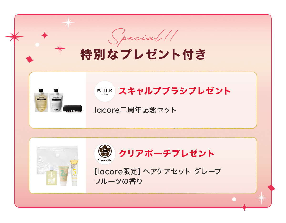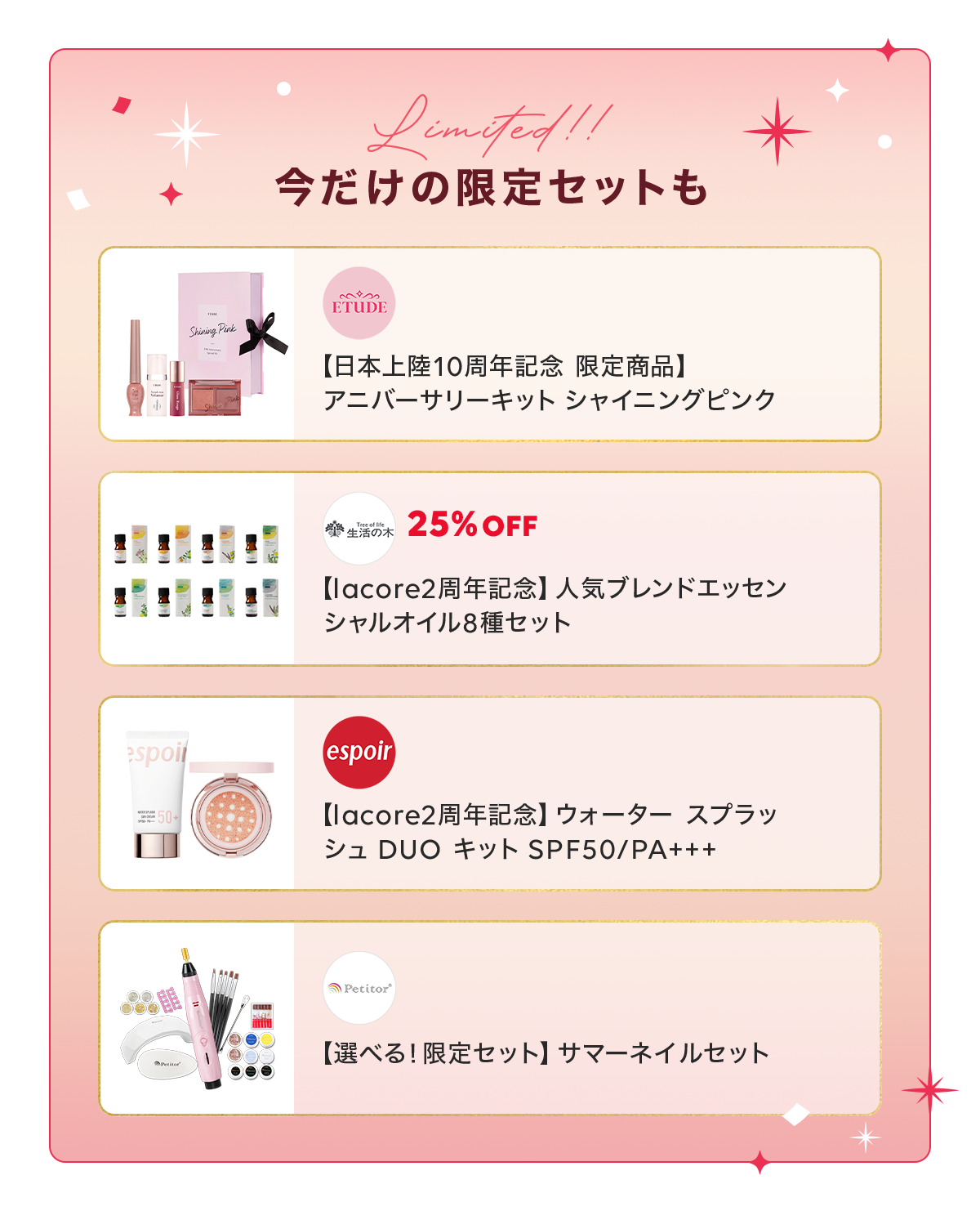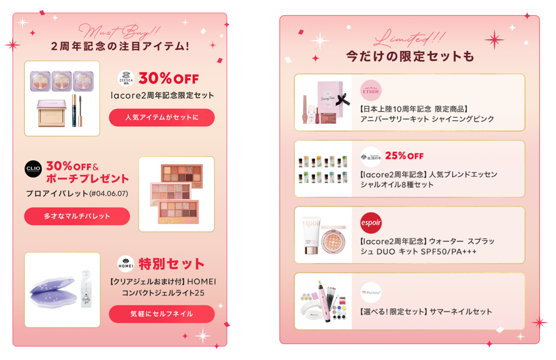 さらに、2周年を記念した今だけの「lacore2周年記念セット」や特別なプレゼント付きのコスメもご用意。今しか手に入れることができないスペシャルなセットアイテムを豊富にご用意しております。