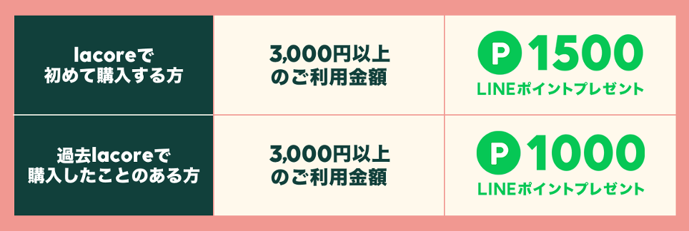 「lacore」での購入が初めての方は、3,000円(税込)以上のご購入でLINEポイントを1,500ポイントプレゼントいたします。