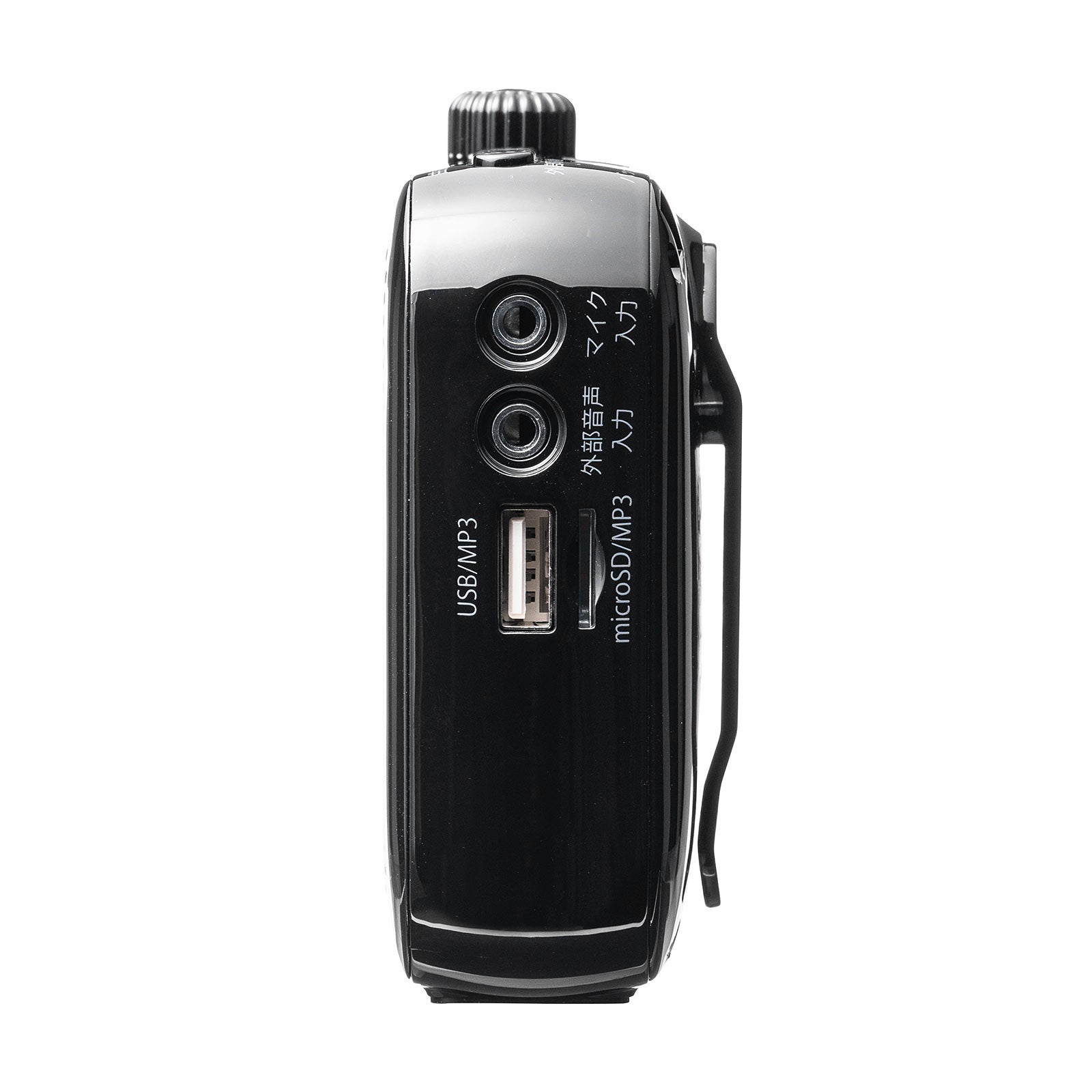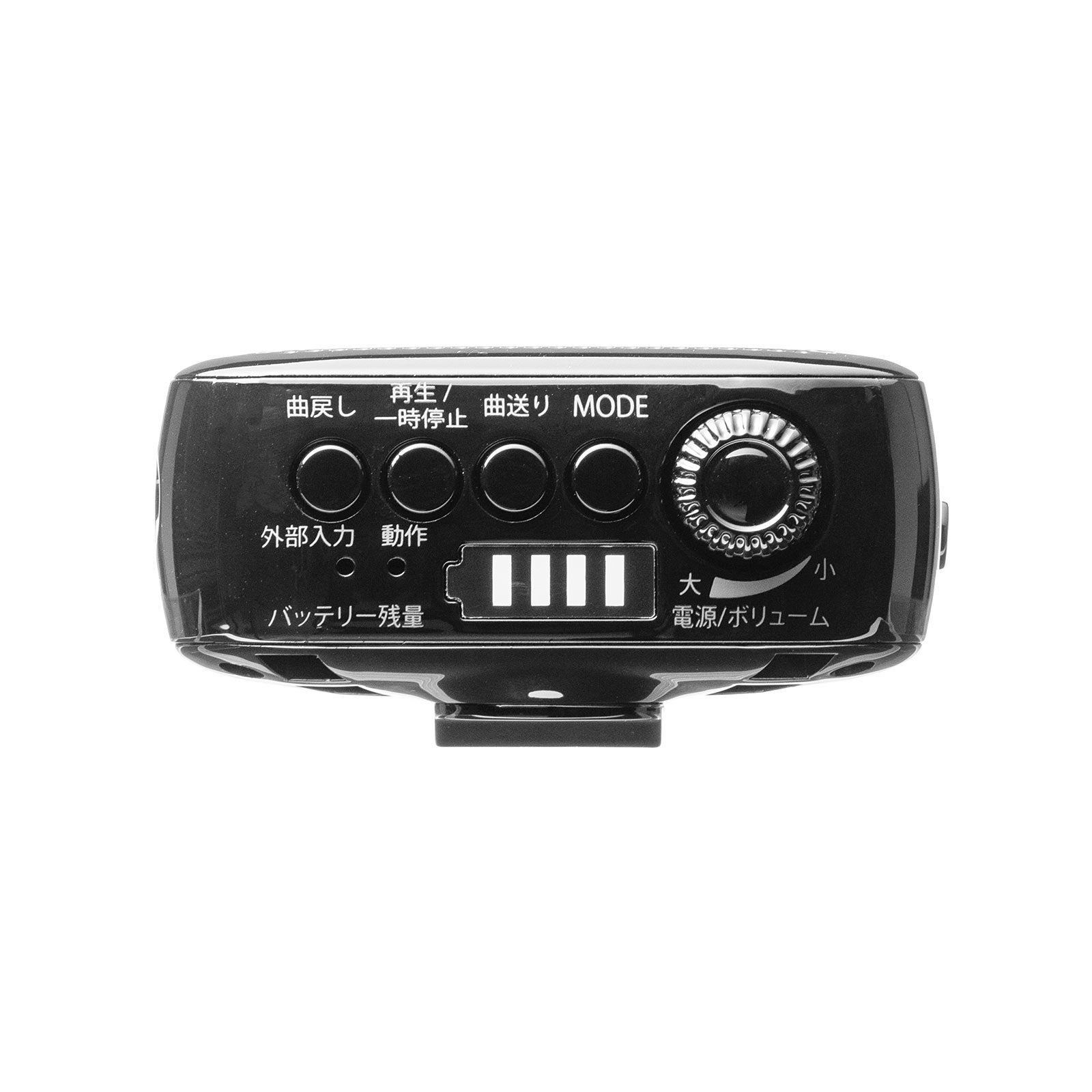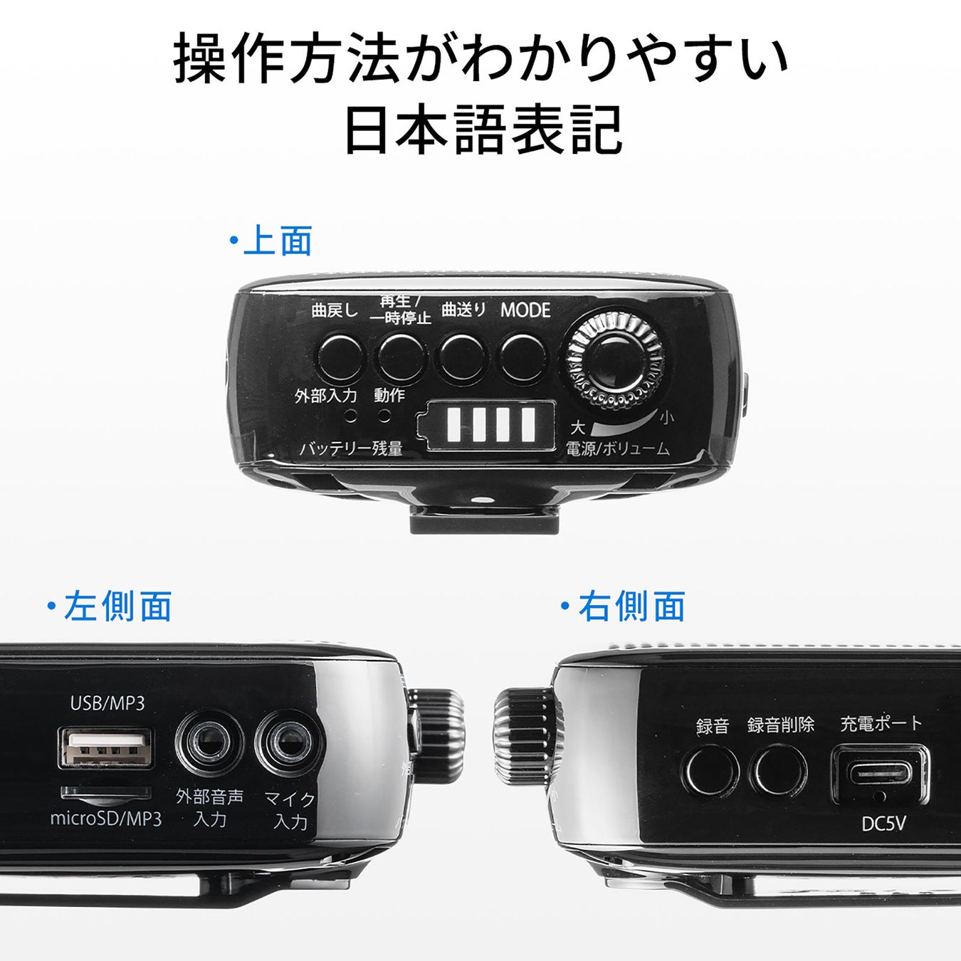 外部音声入力端子(3.5mmジャック)にスマートフォンなどを接続して音楽再生用のスピーカーとして使用できます。USBメモリまたはmicroSDカードに保存したMP3形式の音楽ファイルも再生可能です。また、有線ヘッドマイクから入力した音声をUSBメモリまたはmicroSDカードに録音して、繰り返し再生することができます。