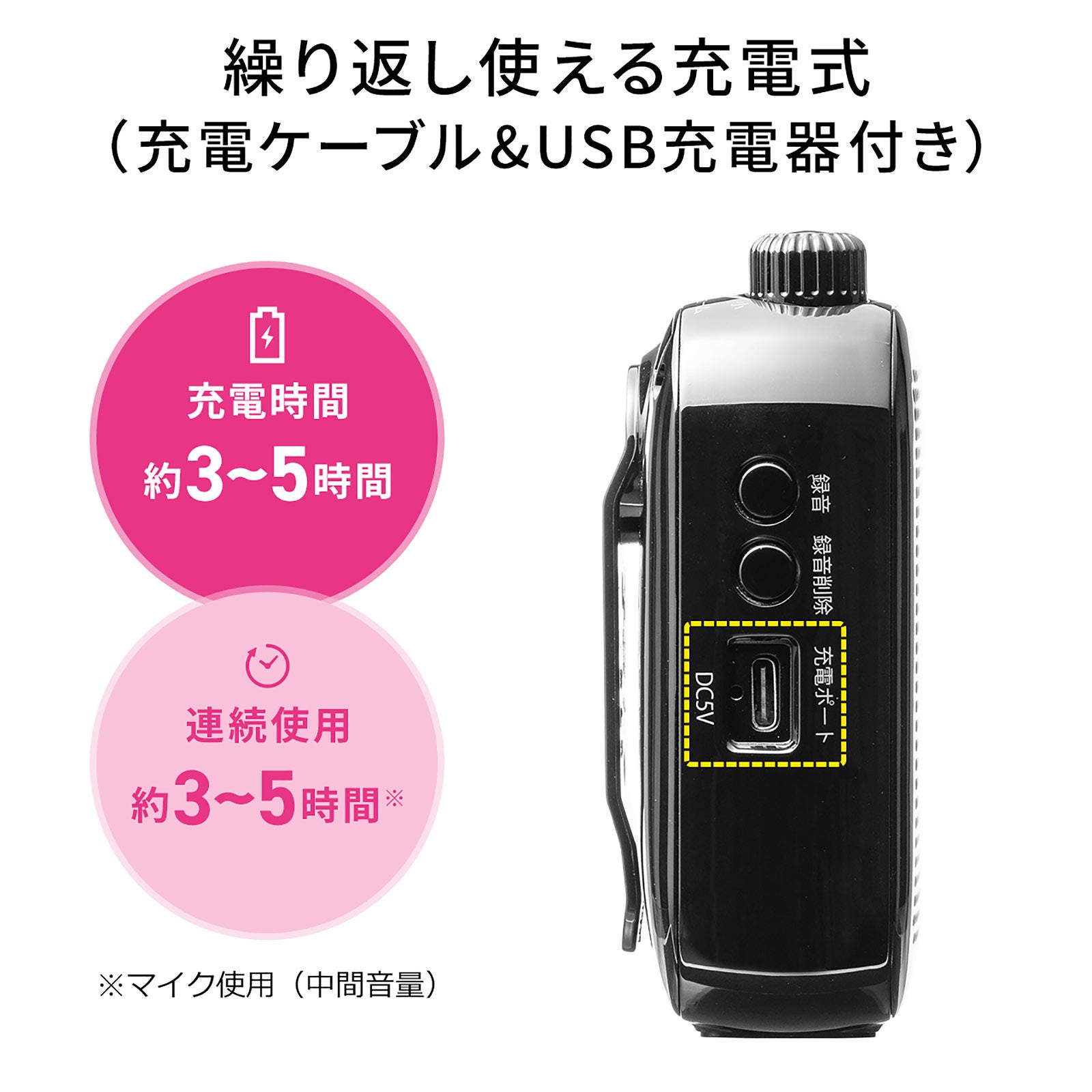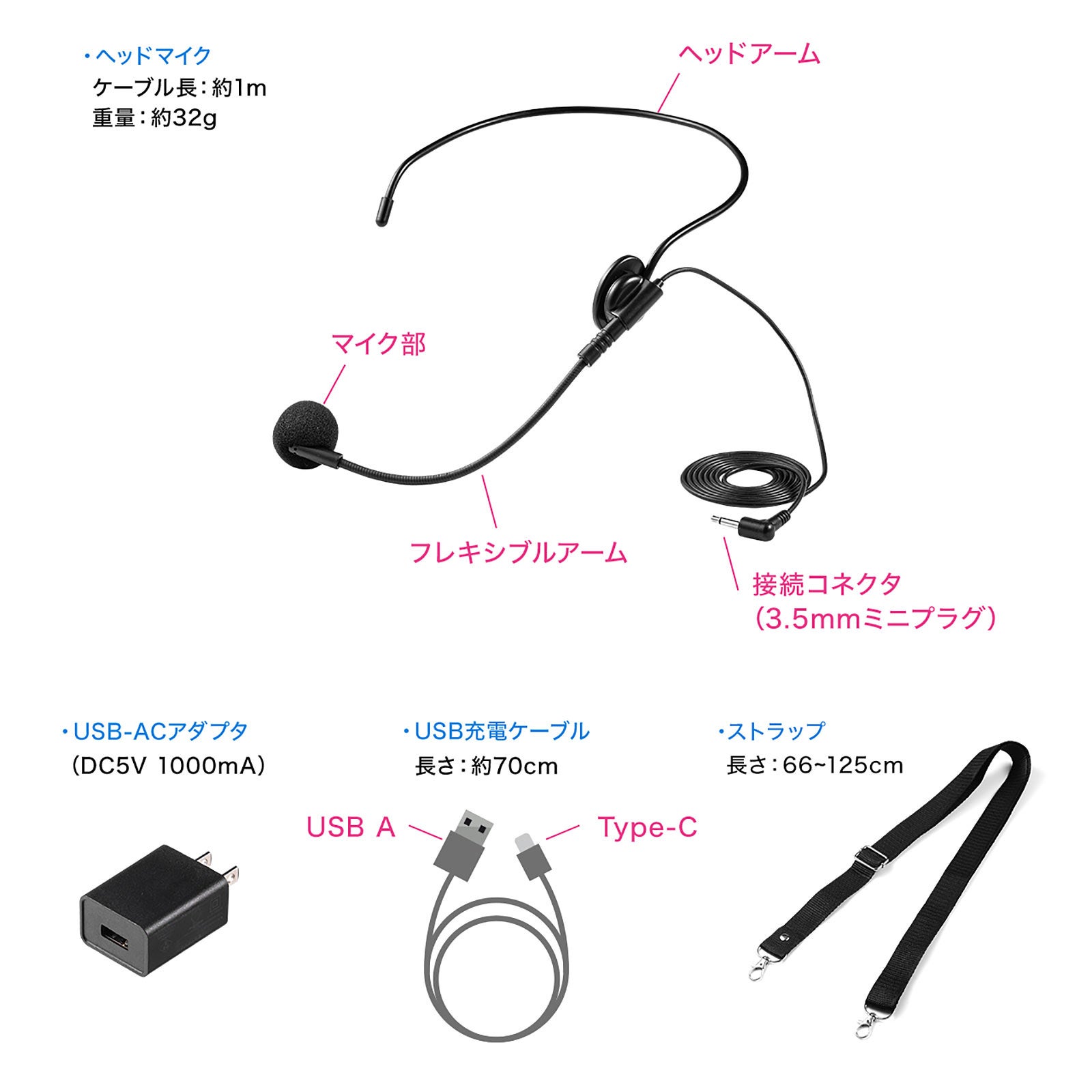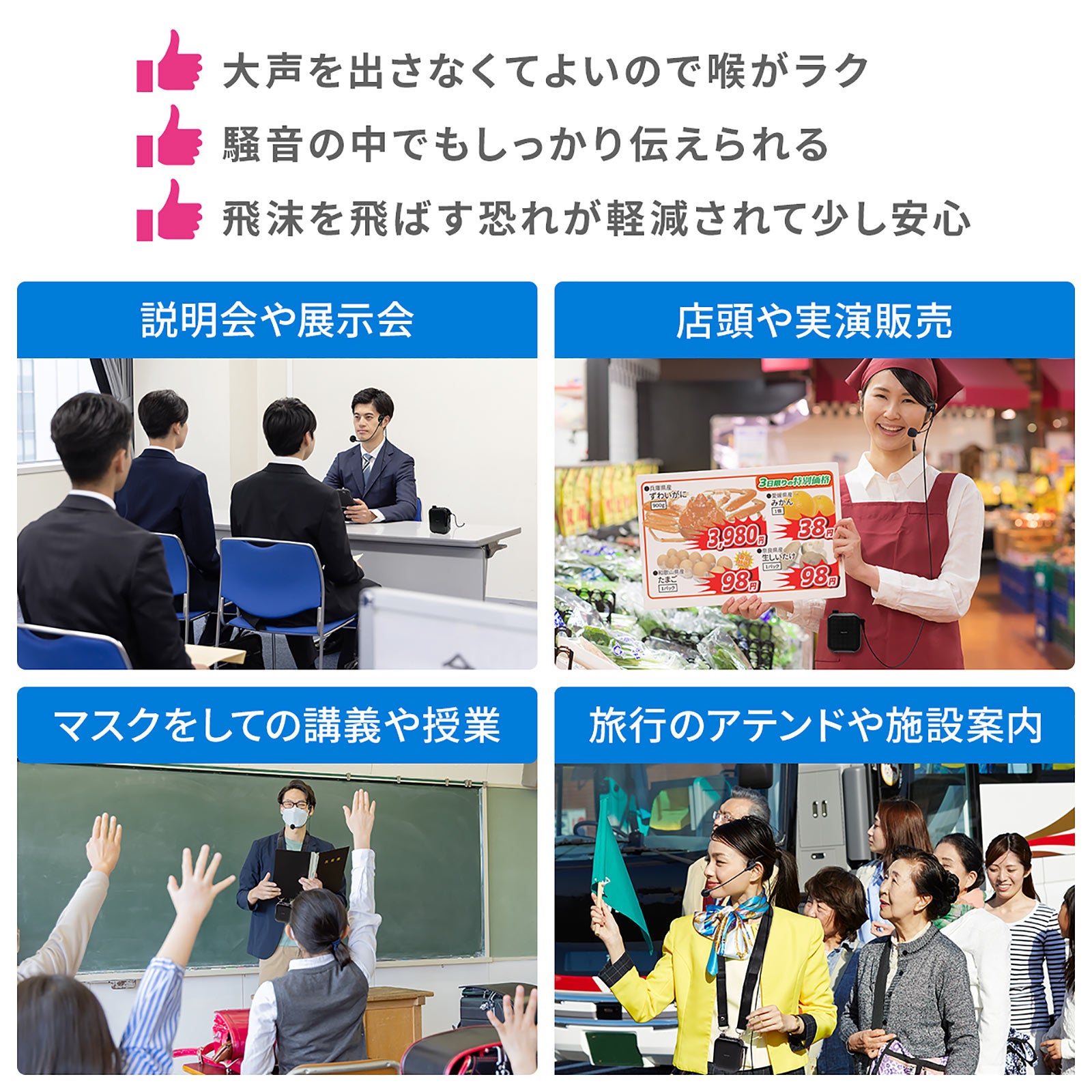 本製品は、大声を出さずに話者の声を遠くまで届けられるポータブル拡声器です。付属のヘッドマイクを頭に装着して、両手を自由に使いながら話せます。