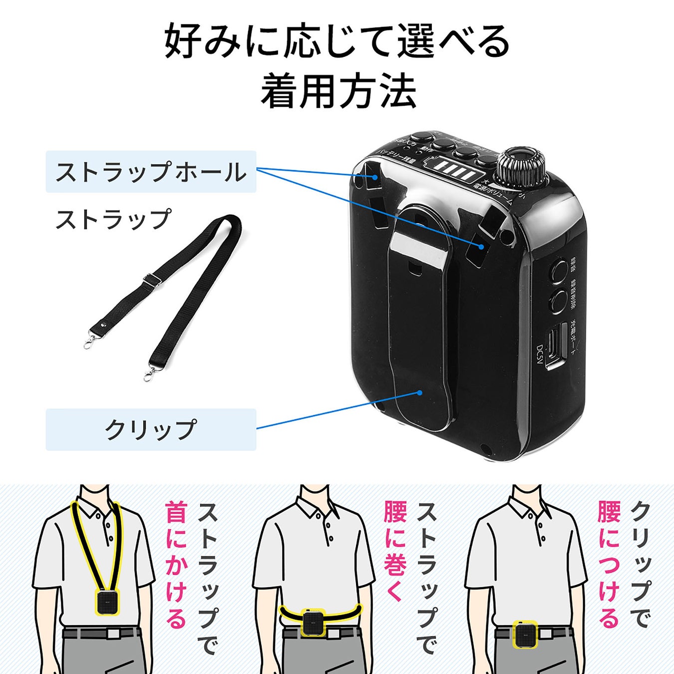 背面のクリップでベルトなどに固定したり、ストラップを使って首にかけたりして使用できます。