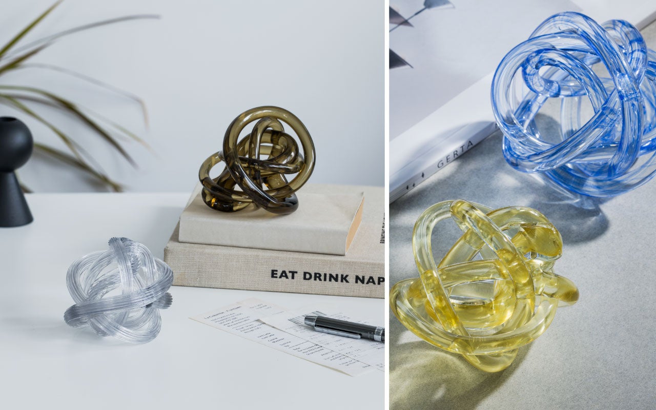 引きのばされたガラスをくるくる丸めたようなアーティーなオブジェ。巻き方や形のバランスなど、ひとつひとつ違うのも素敵です。作り手の感性が生かされた直径約10センチの不思議な存在感は、リビングや寝室など、おうちの好きな空間に置くだけで、洗練された雰囲気に。カラーはシーモノらしいこだわりが感じられる〈FLOW〉〈REPETITION〉〈CIRCUIT〉〈STREAM〉の4種類です。当たる光によってさまざまな表情が楽しめる美しいデザインです。