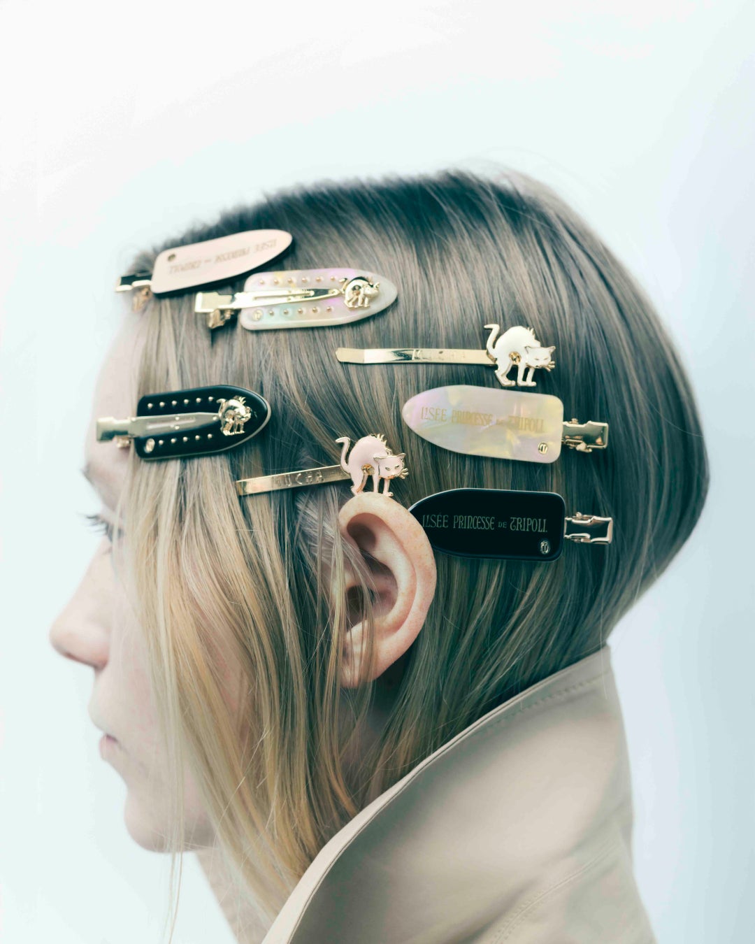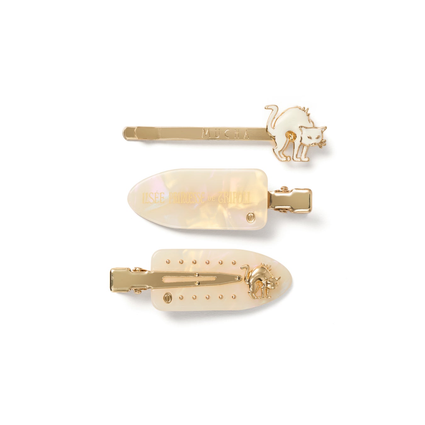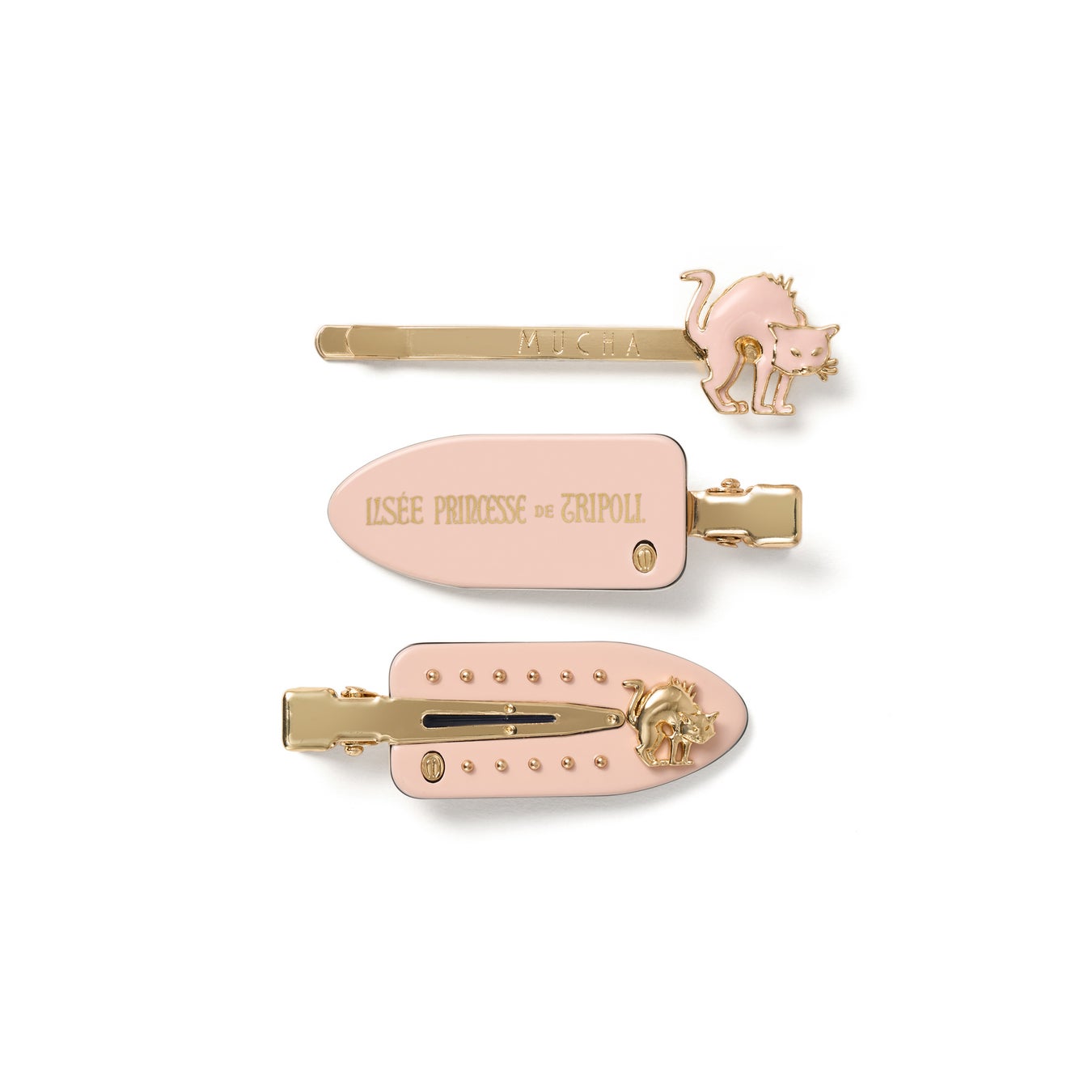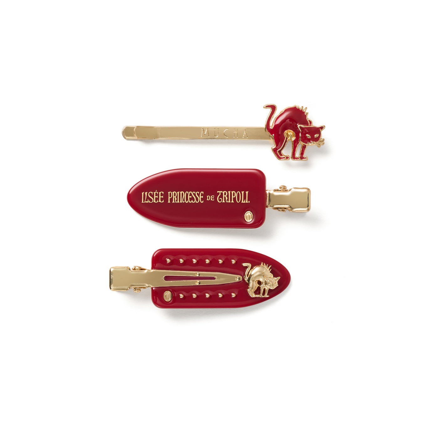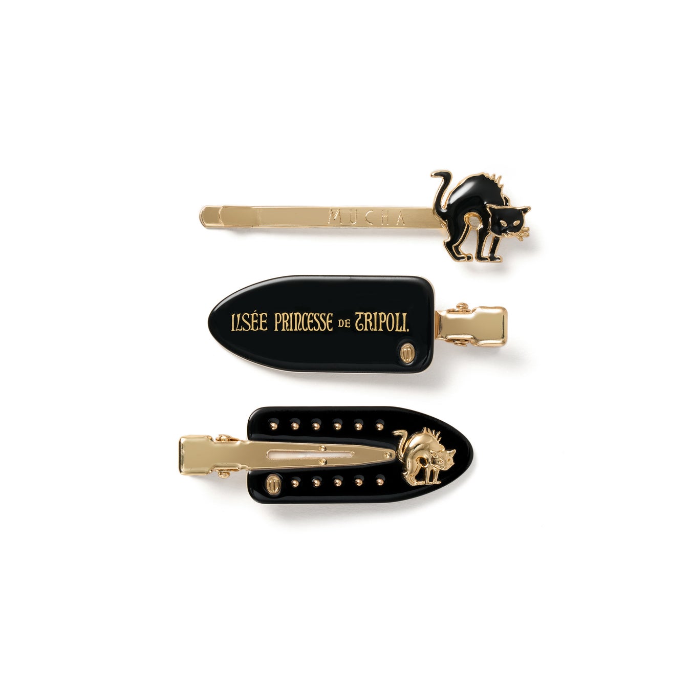「トリポリの姫君イルゼ」から、挿絵に描かれた毛を逆立てたポーズが可愛い猫のデザインを施しました。ユニークな猫のアイコンがアクセントのサイドヘアクリップとヘアピンの3点セット。スタイリングに合わせて重ねづけや単品使いで自由にお楽しみいただけます。猫好きの方のギフトにも最適です。