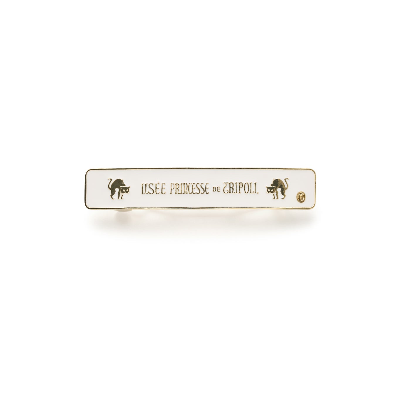 「トリポリの姫君イルゼ」から挿絵に描かれた猫をモチーフにスタイリングを選ばないシンプルなメタルヘアバレッタ。ミュシャの描いた象徴的なフォントが際立つエナメル風メタルが遊び心と洗練された女性らしさを演出します。